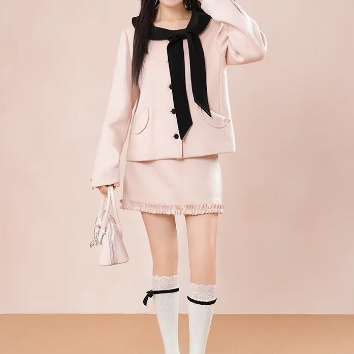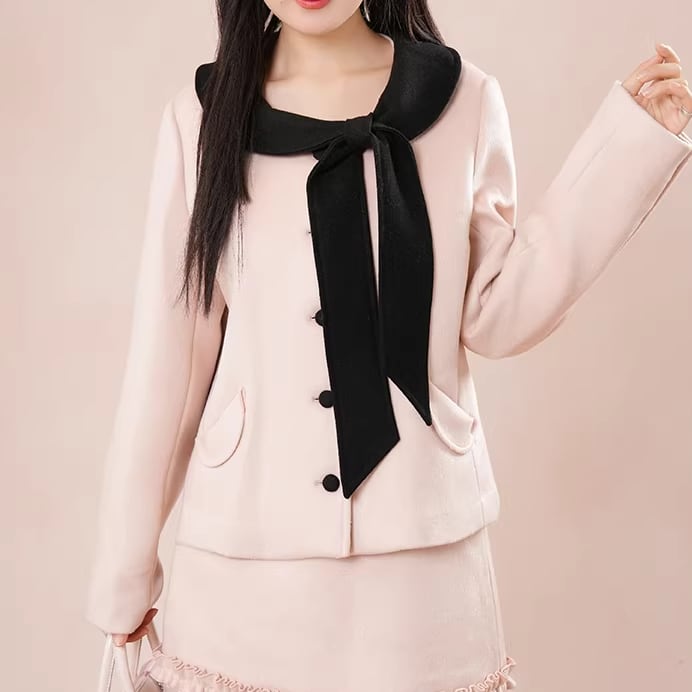 【2点セット】ファーカラーリボンジャケット+ティアードスカート ・75381