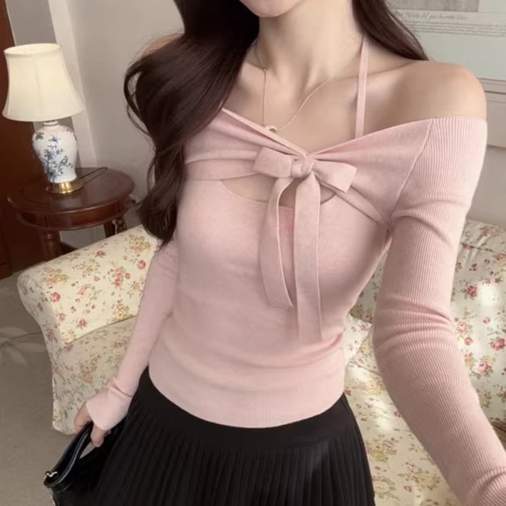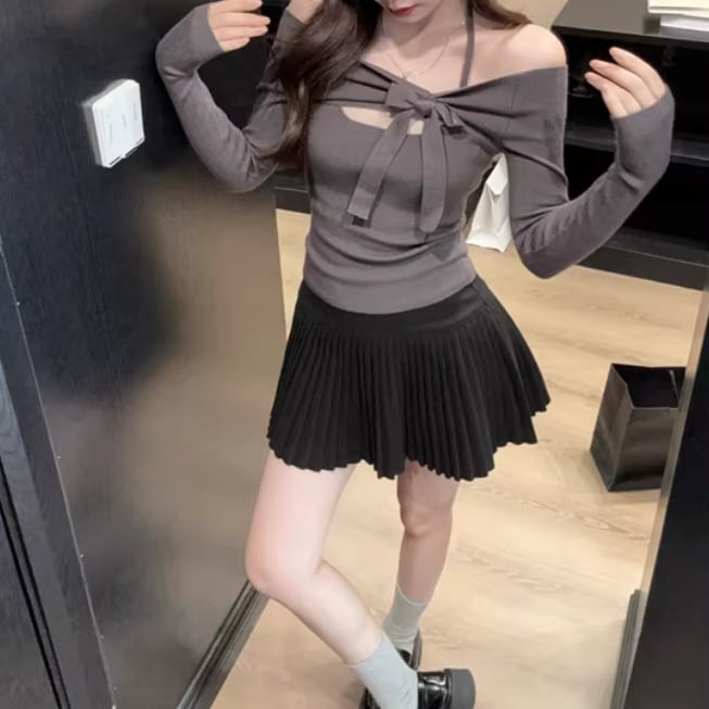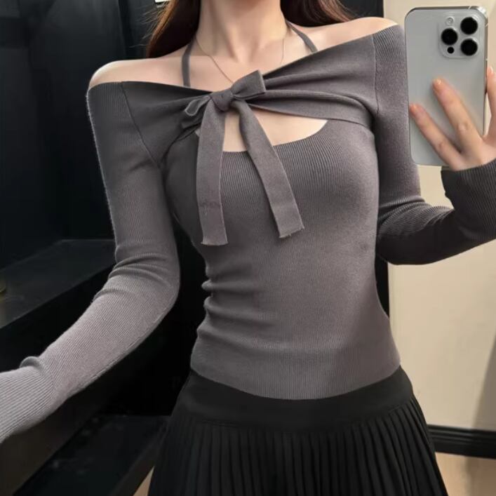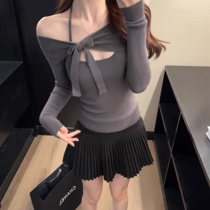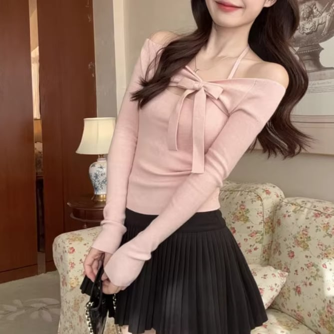 2色/フェイクレイヤードフーデッドニットトップス ・75335