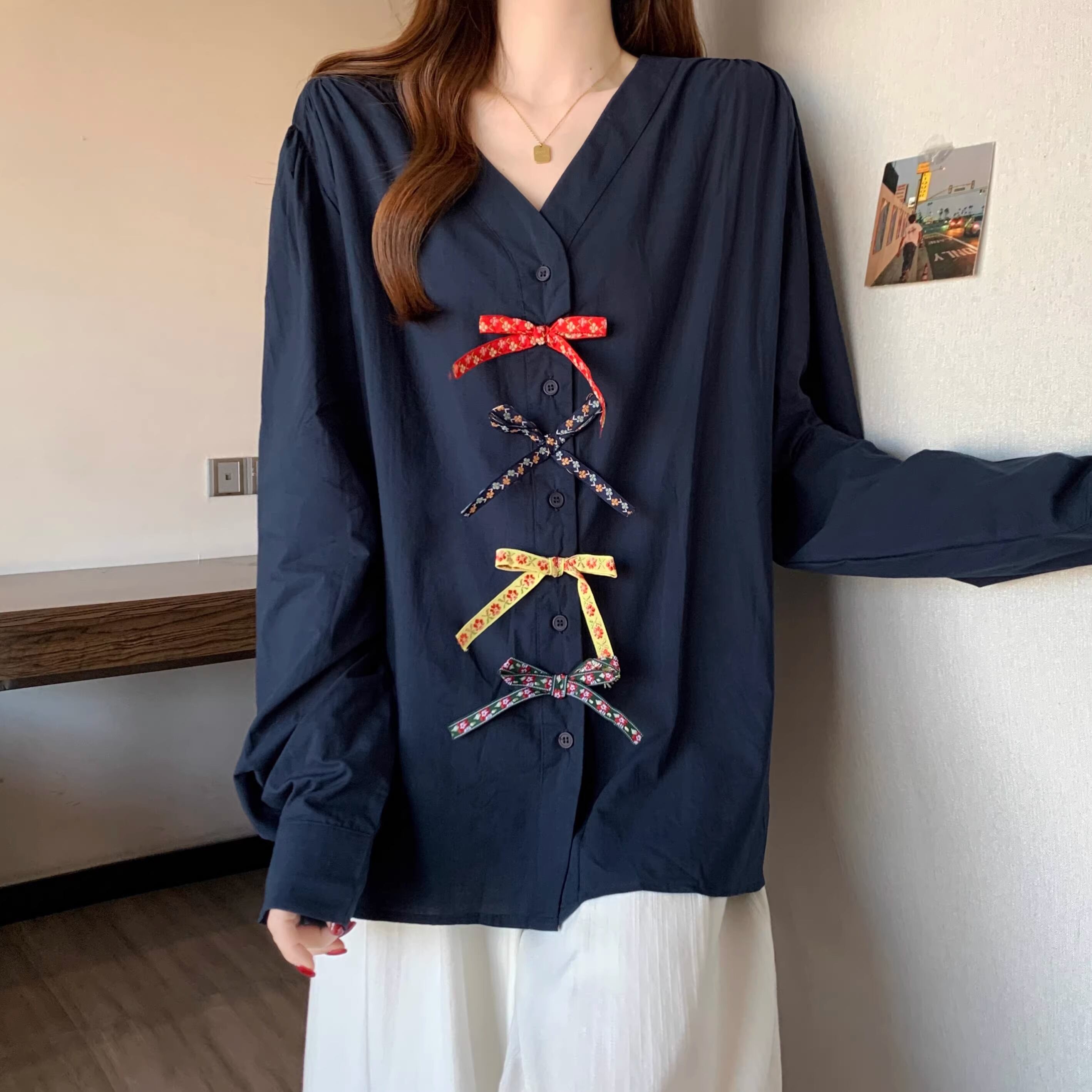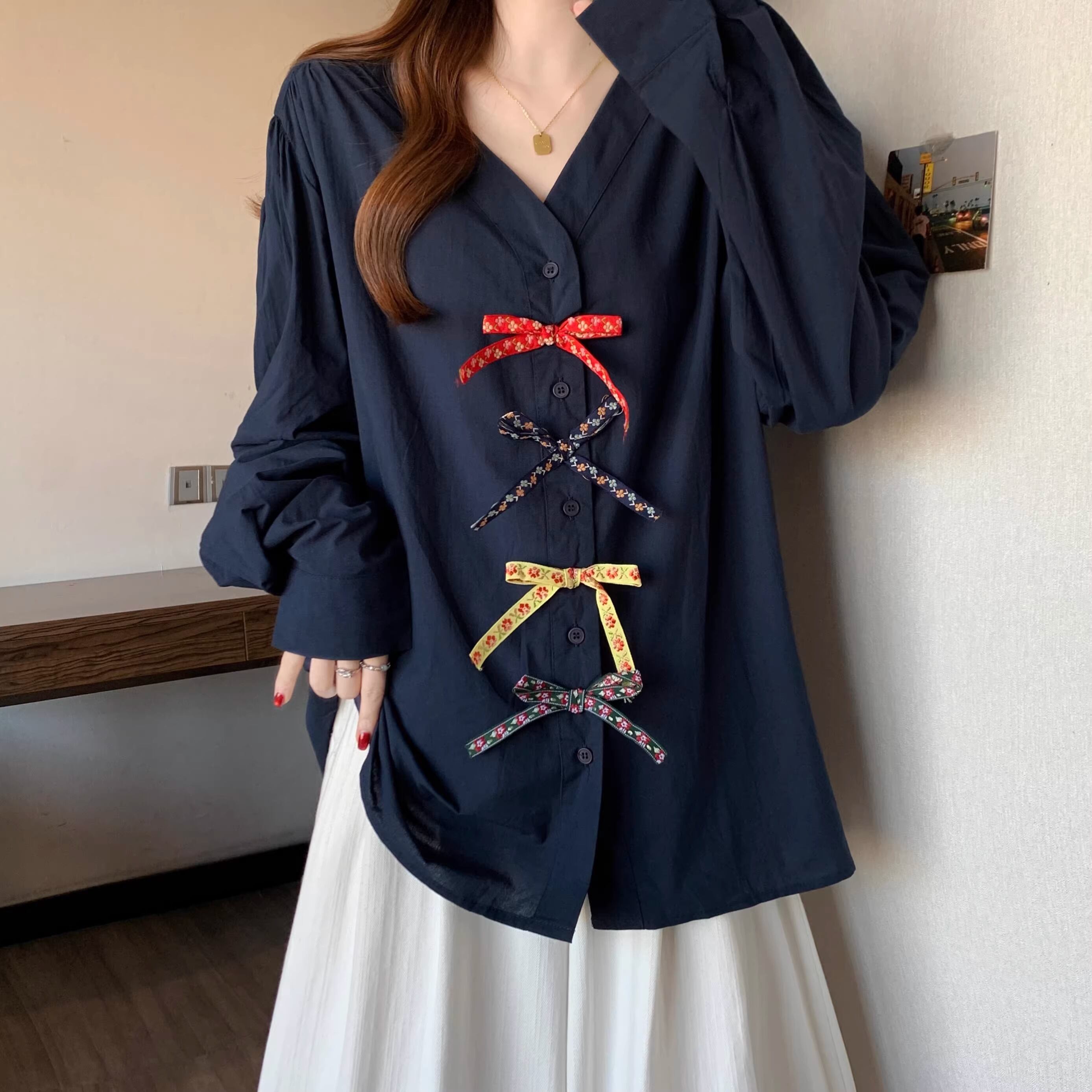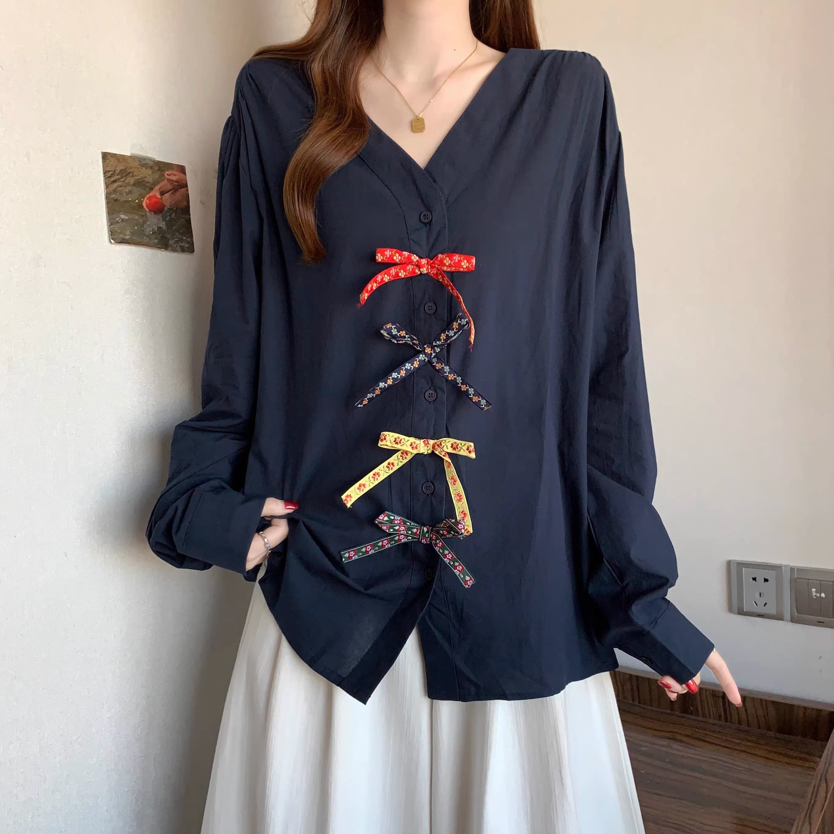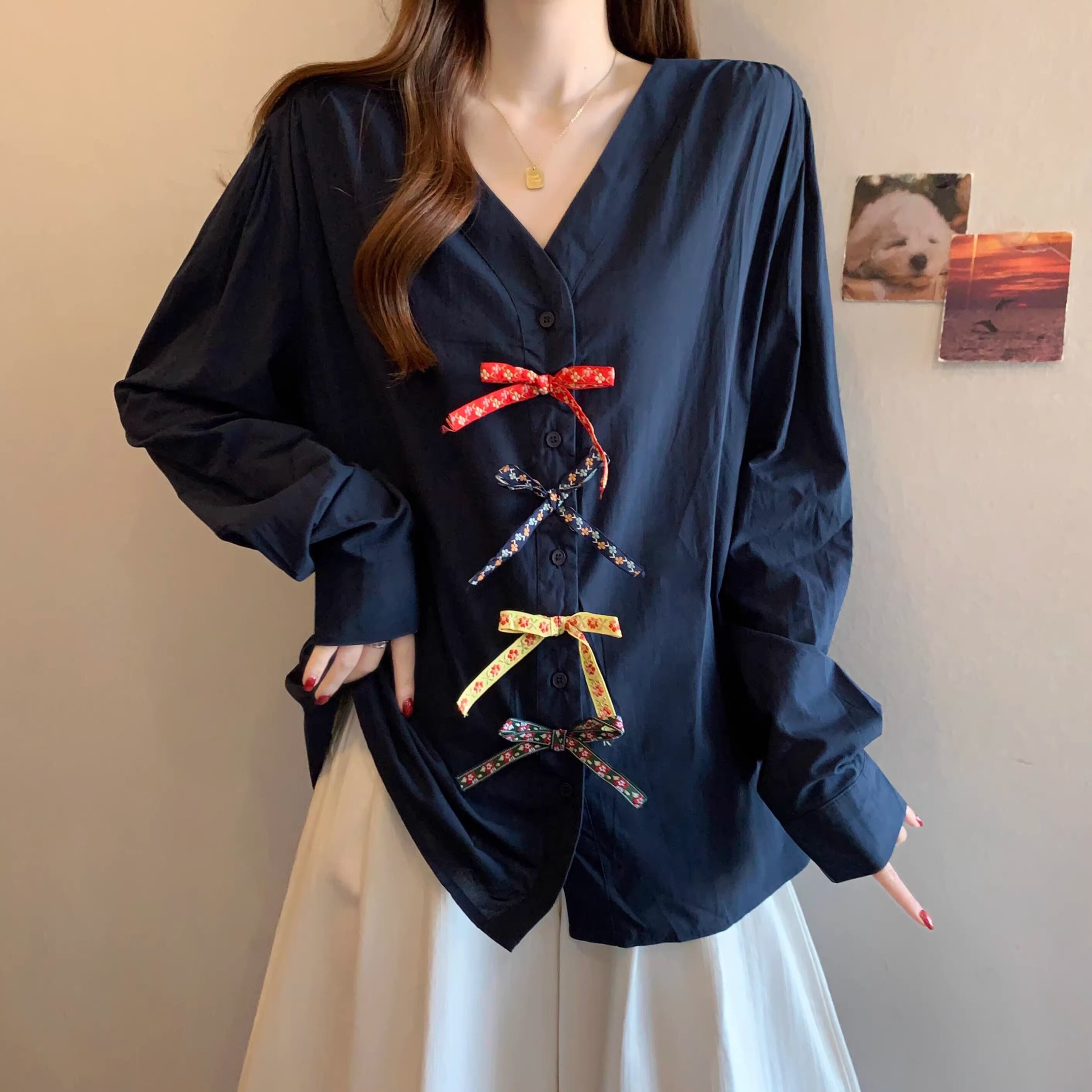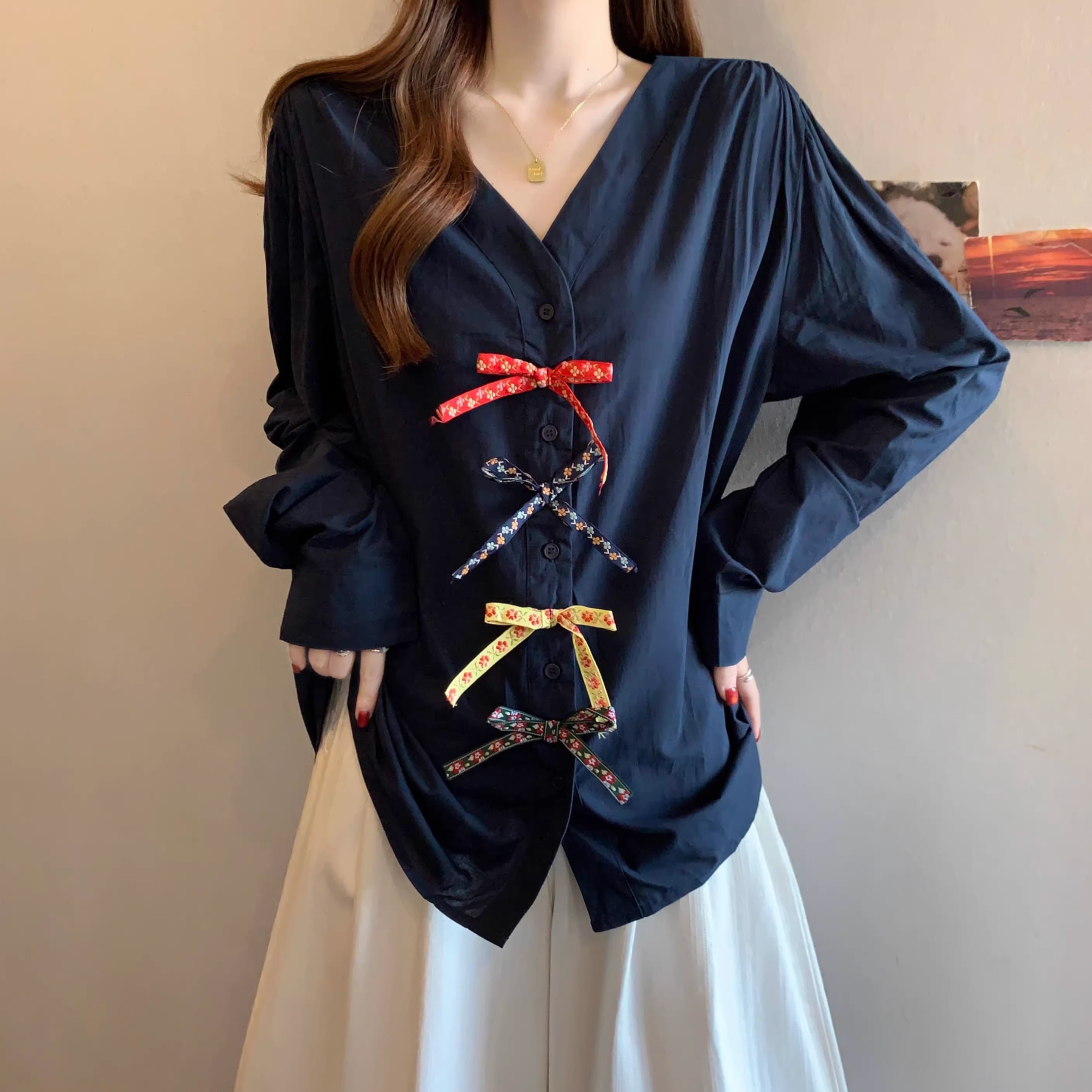 3色/ドロストリボンアシメデザインシャツ ・75363
