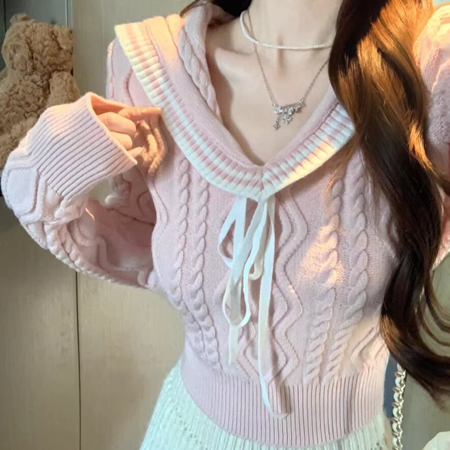 2色/バックリボンレースVネックニット ・75154