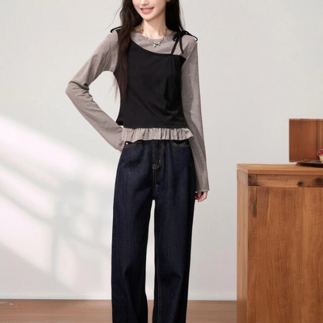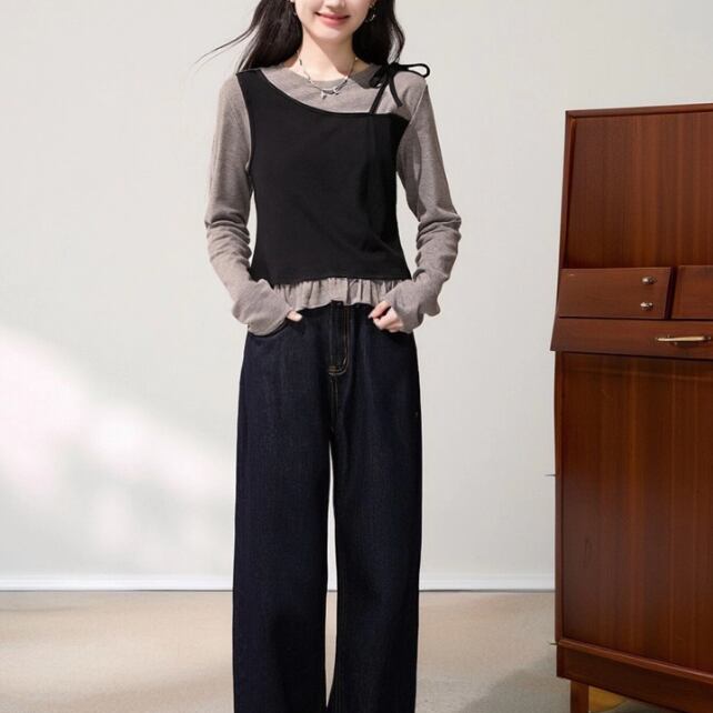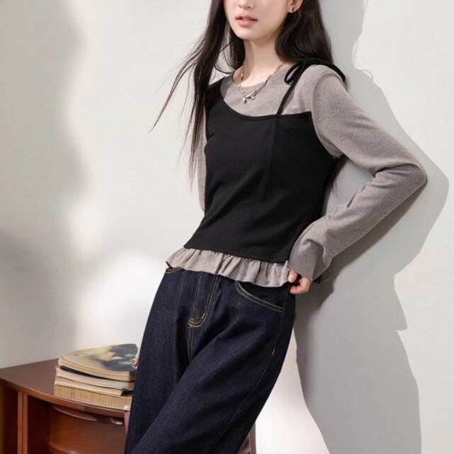 レースカラーアシメボタンドッキングトップス ・71106