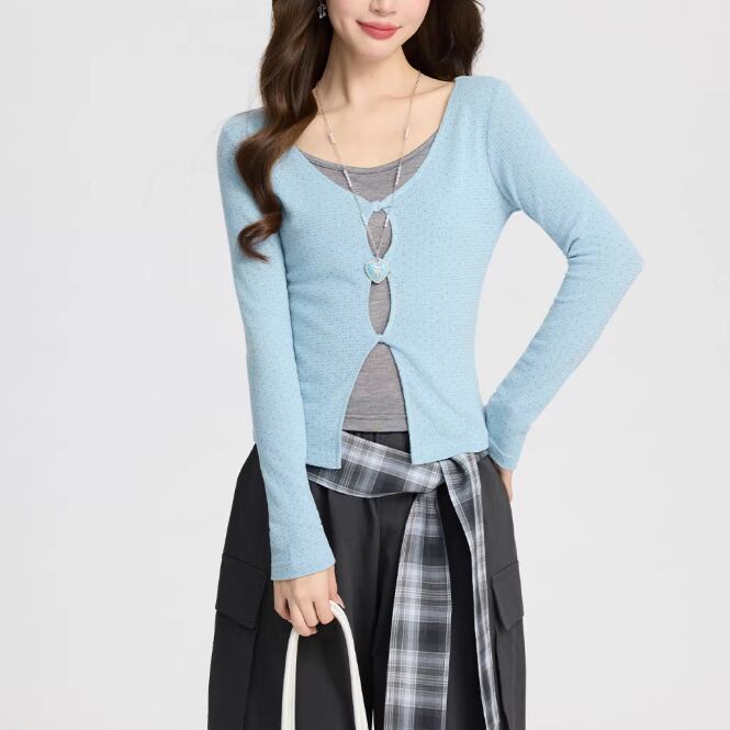 レースカラーアシメボタンドッキングトップス ・71106