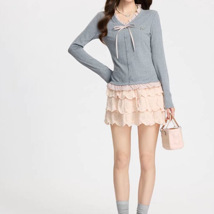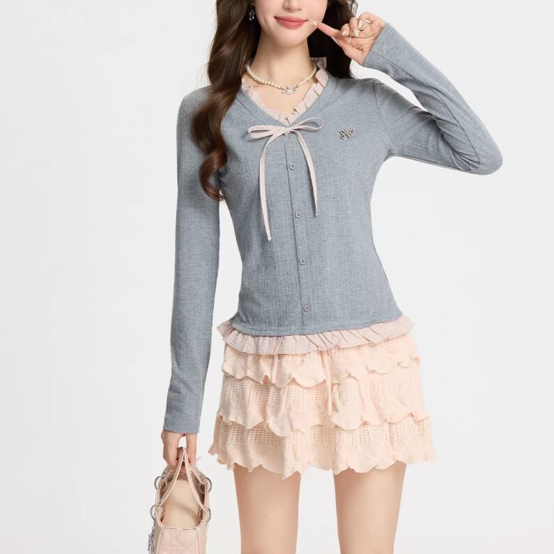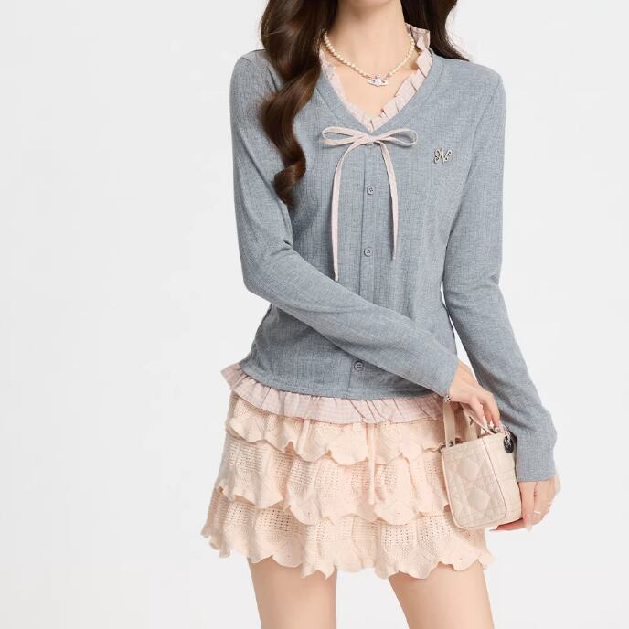 レースカラーアシメボタンドッキングトップス ・71106