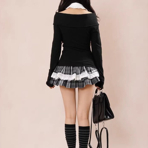 【2点セット】3色/パールデコフリルオフショルセーター+ニットミニスカート ・73703