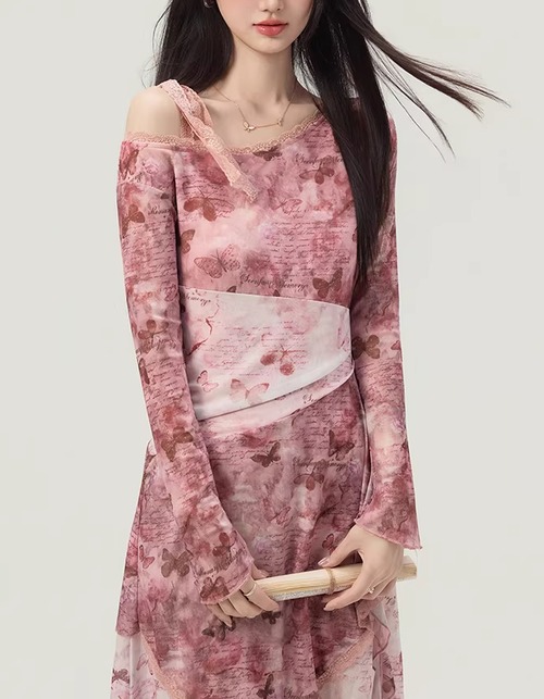 2色/チュールフラワーフリルネックボウタイワンピ ・54889