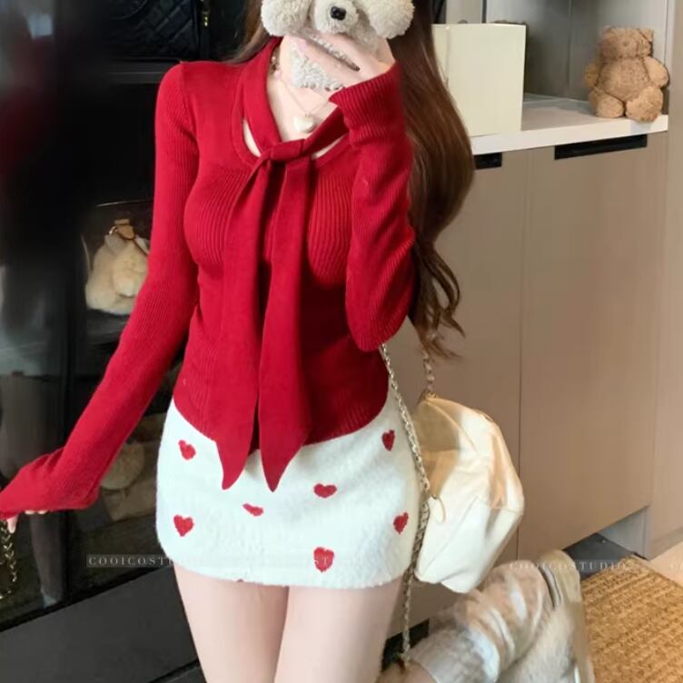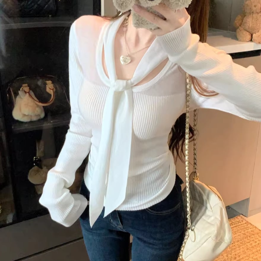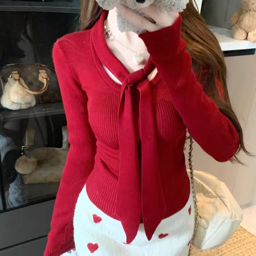 2色/バックリボンレースVネックニット ・75154
