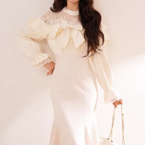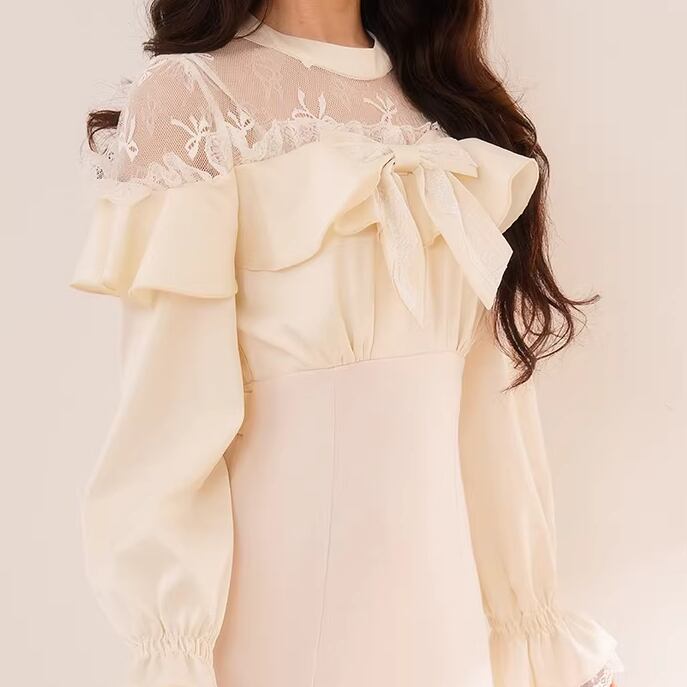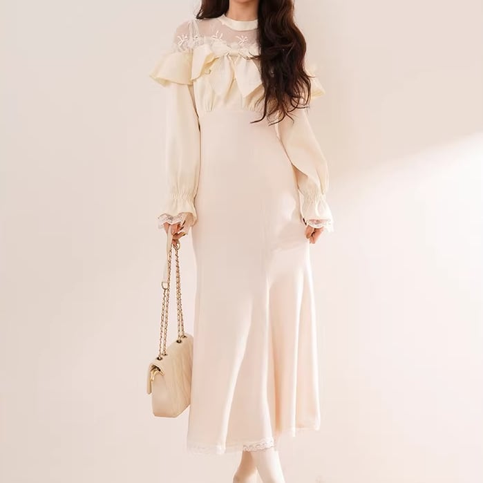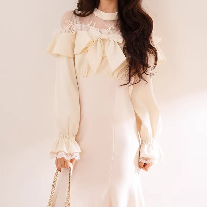 2色/チュールフラワーフリルネックボウタイワンピ ・54889