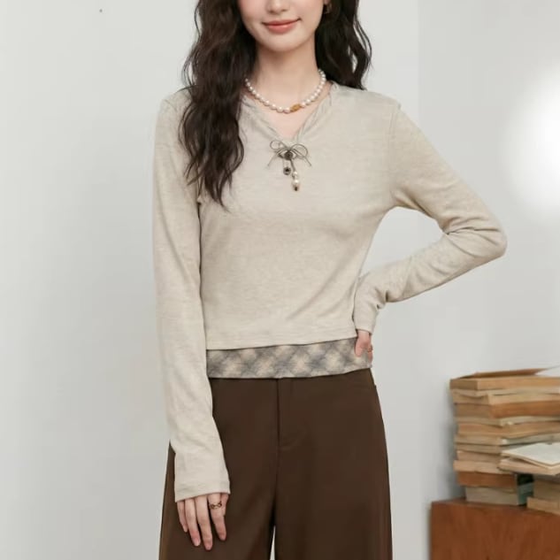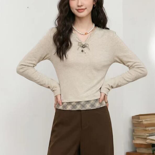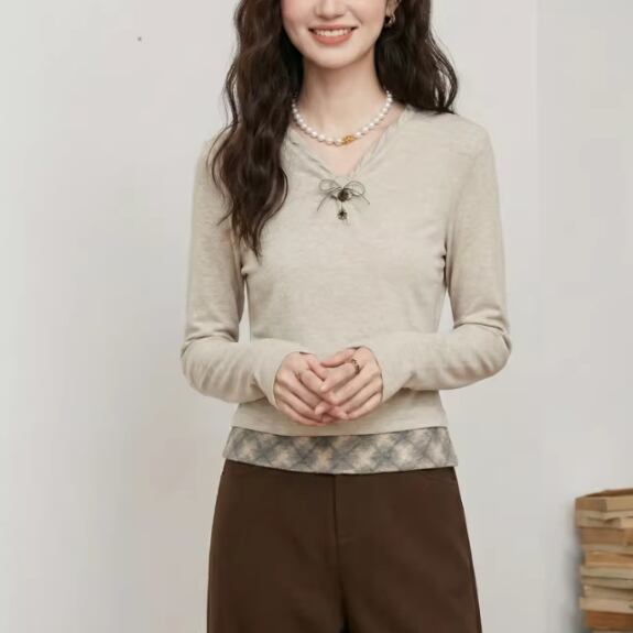 2色/フェイクレイヤードフーデッドニットトップス ・75335