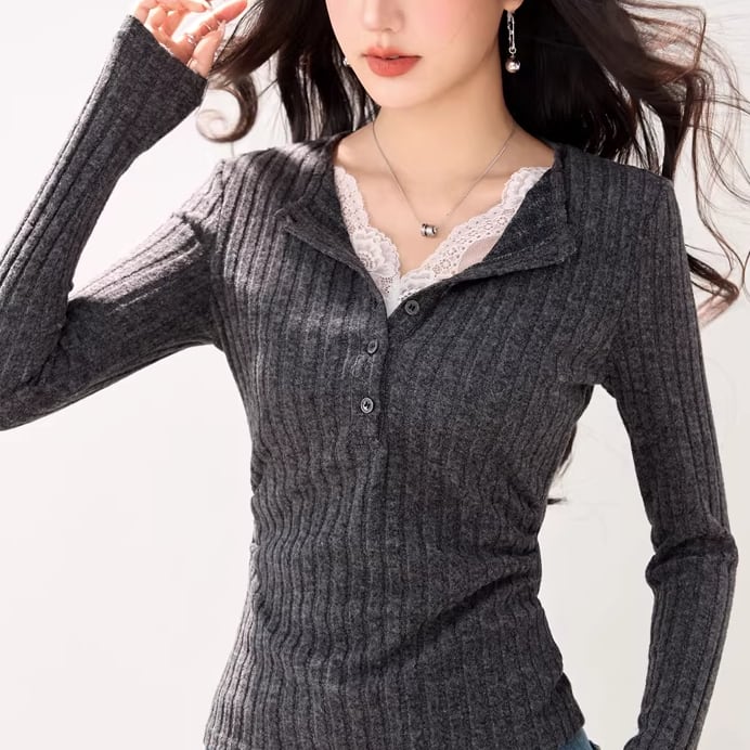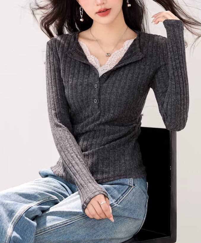 2色/フェイクレイヤードフーデッドニットトップス ・75335