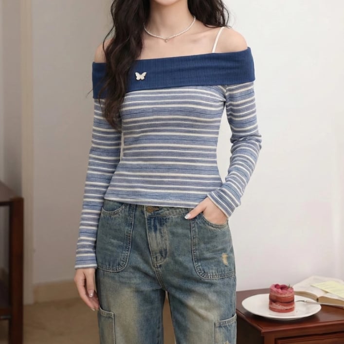 2色/フェイクレイヤードフーデッドニットトップス ・75335