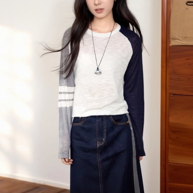 2色/フェイクレイヤードフーデッドニットトップス ・75335