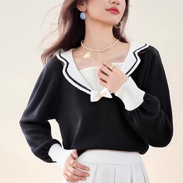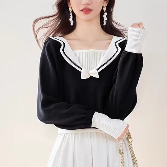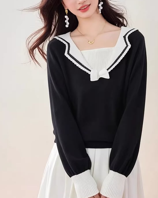 2色/フェイクレイヤードフーデッドニットトップス ・75335
