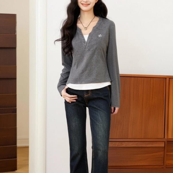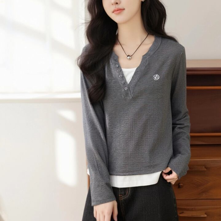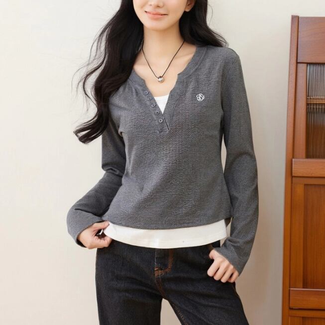 レースカラーアシメボタンドッキングトップス ・71106