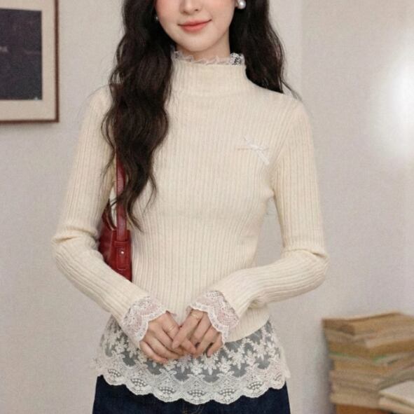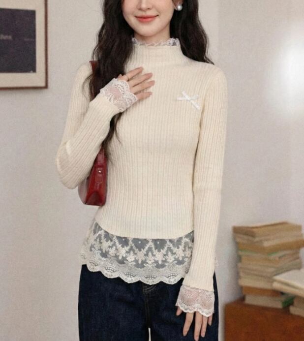 2色/フェイクレイヤードフーデッドニットトップス ・75335