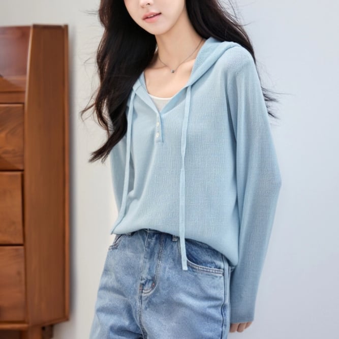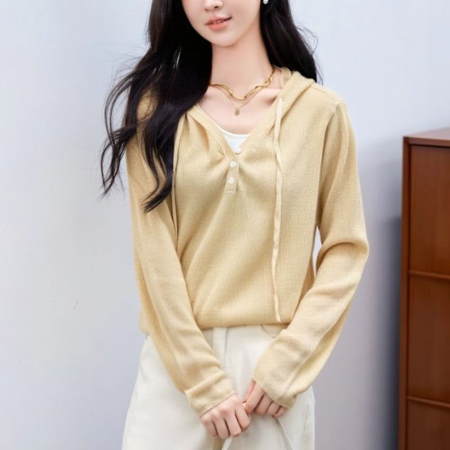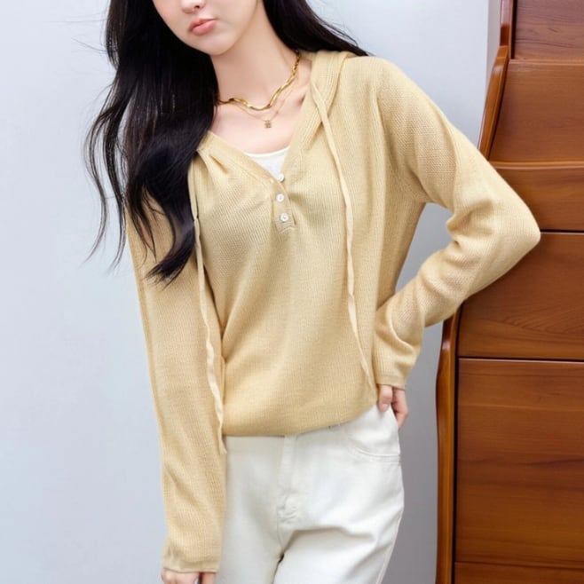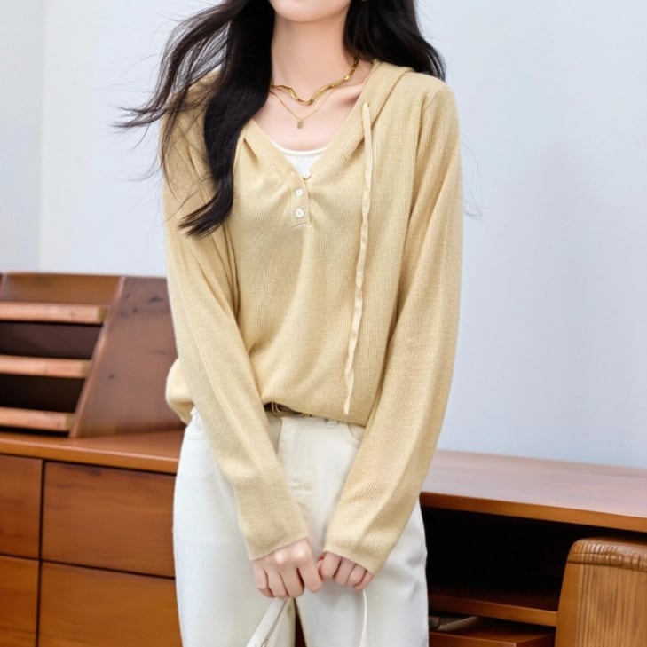 2色/フェイクレイヤードフーデッドニットトップス ・75335