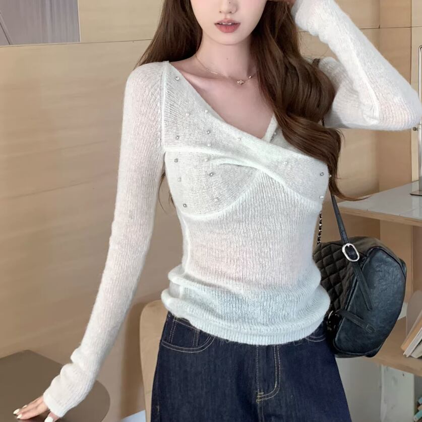 2色/フェイクレイヤードフーデッドニットトップス ・75335