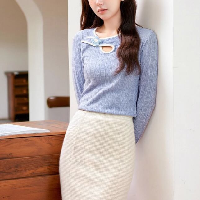 2色/フェイクレイヤードフーデッドニットトップス ・75335