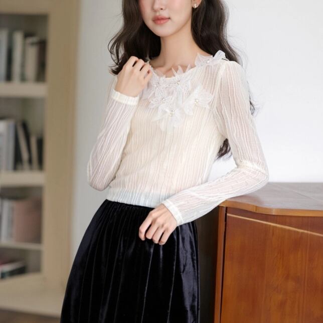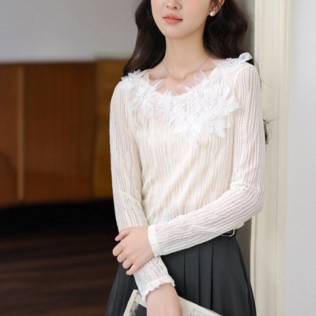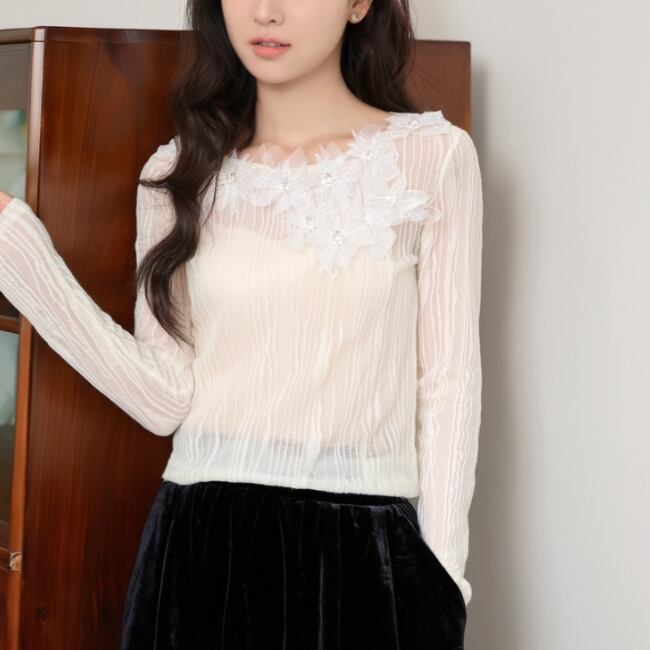 レースカラーアシメボタンドッキングトップス ・71106