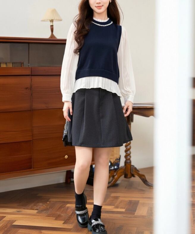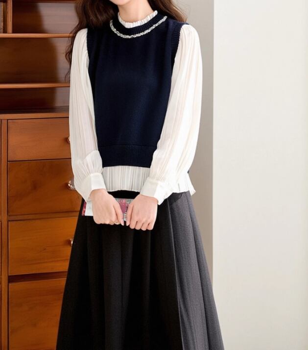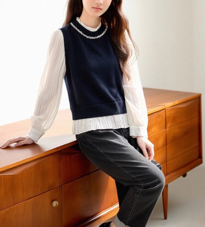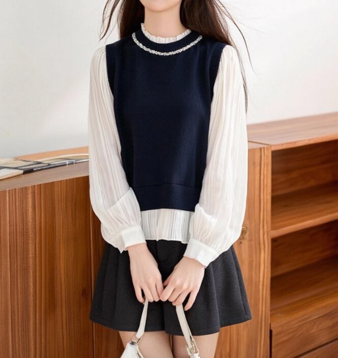 2色/フェイクレイヤードフーデッドニットトップス ・75335