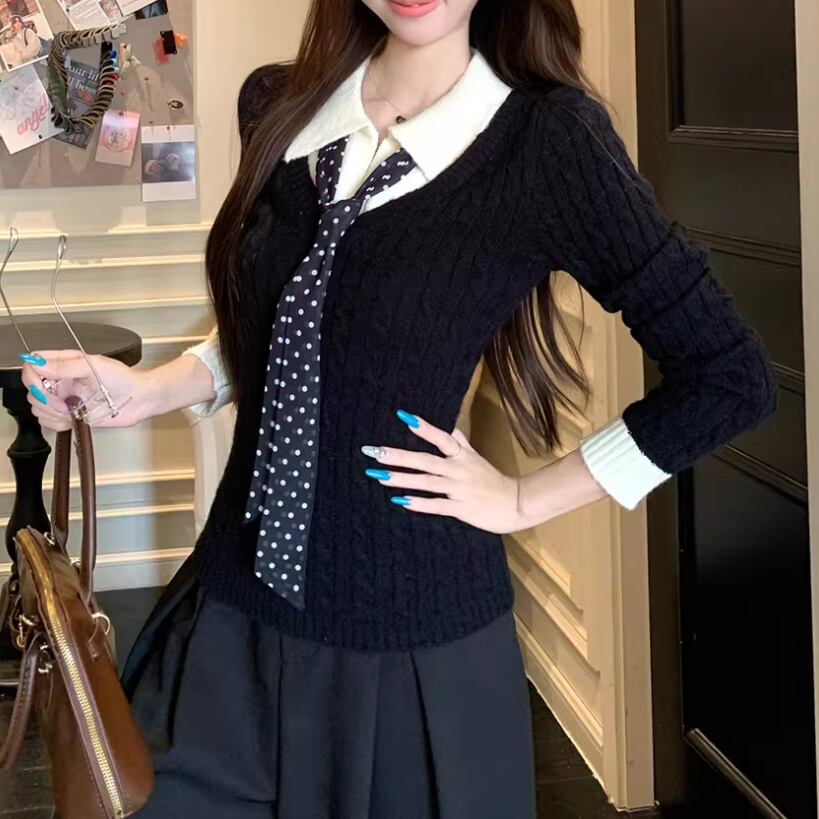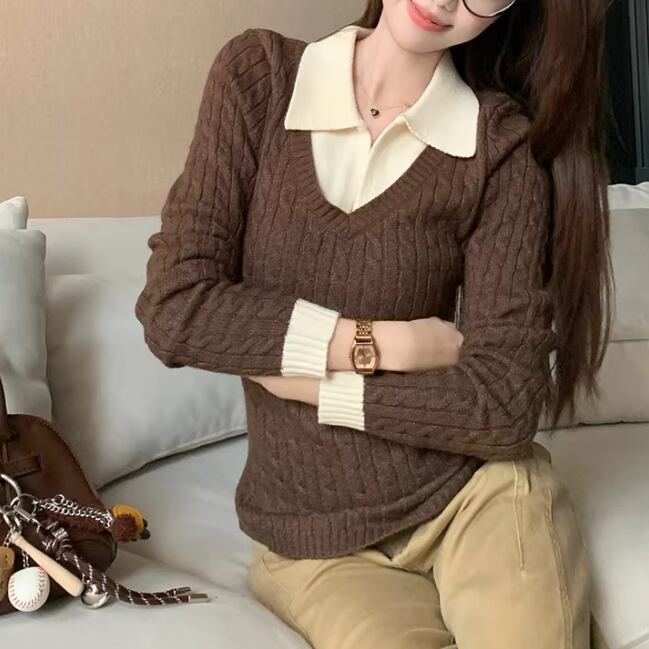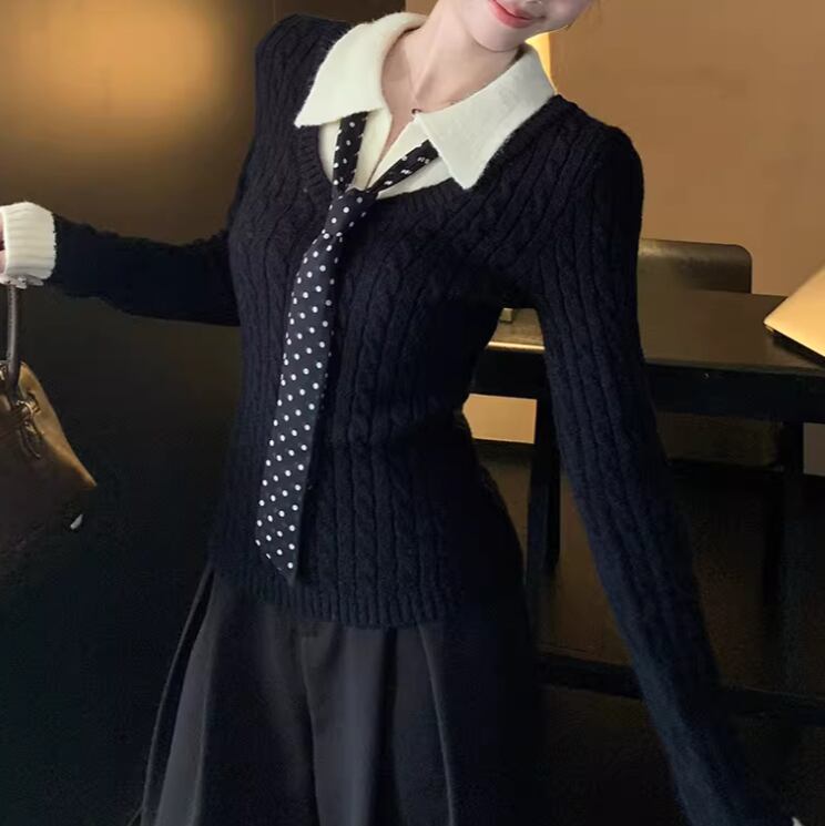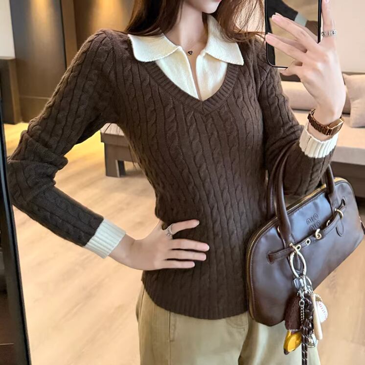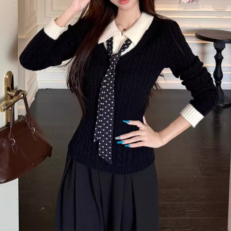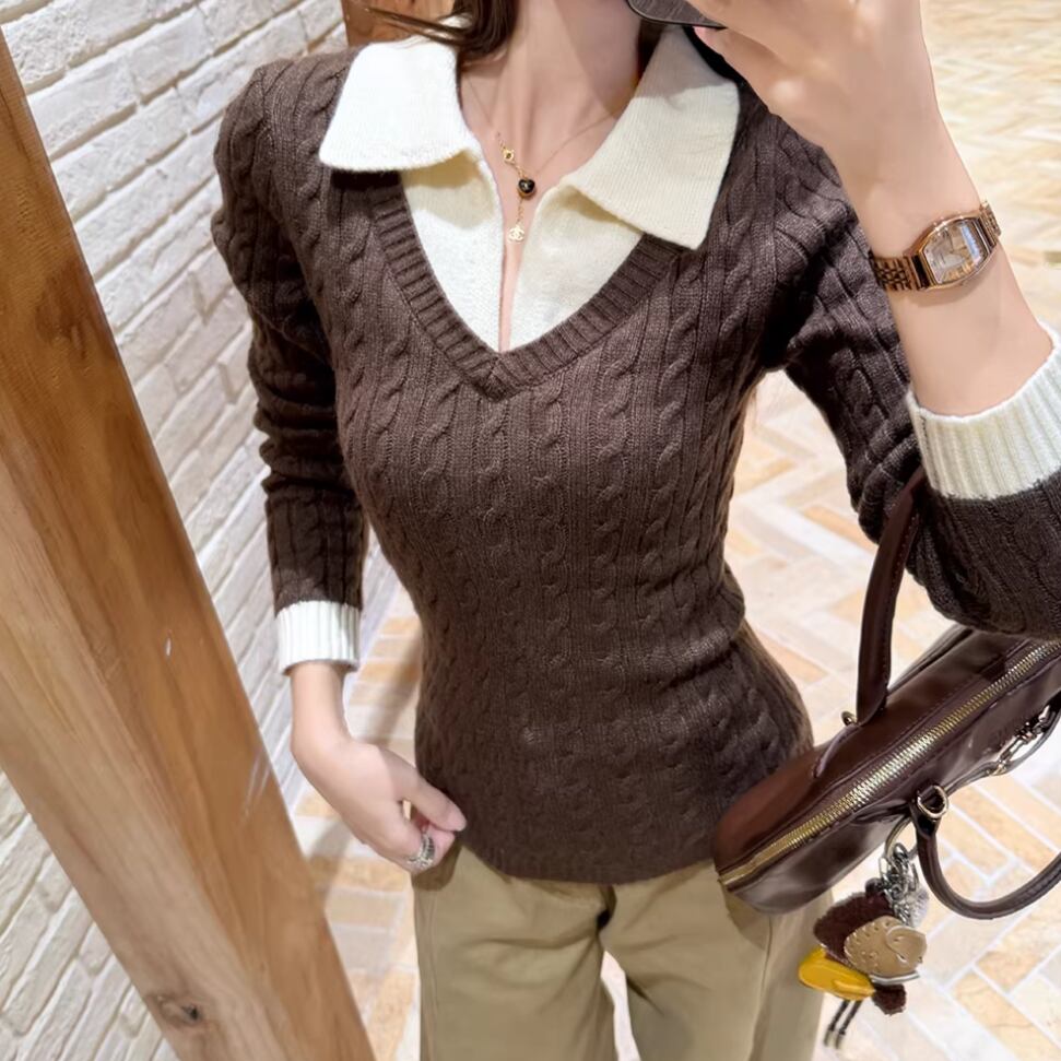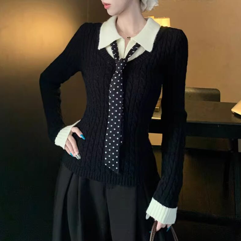 2色/バックリボンレースVネックニット ・75154