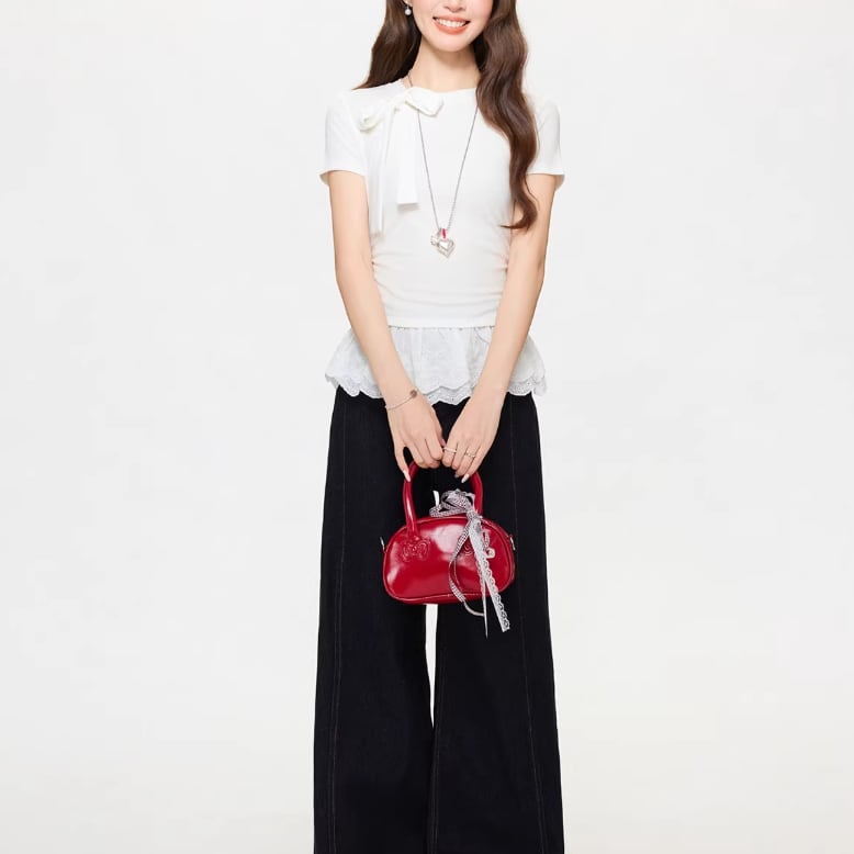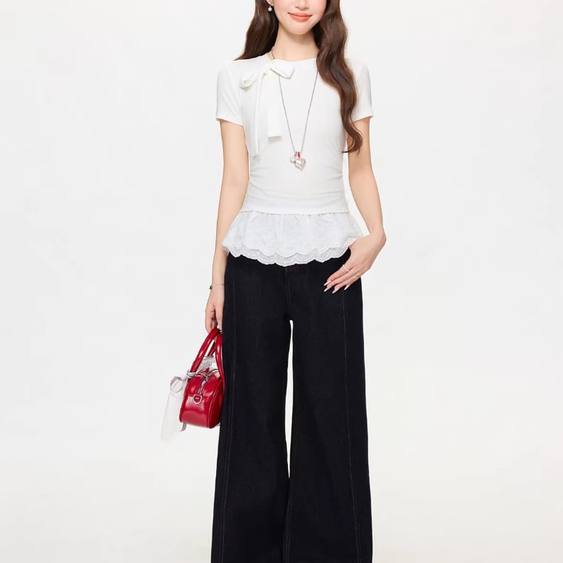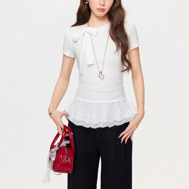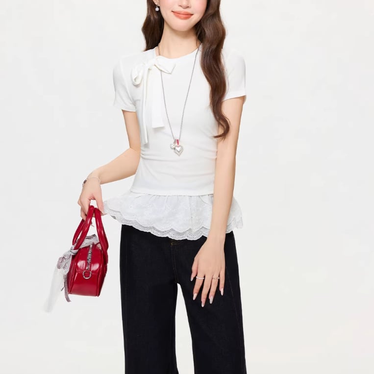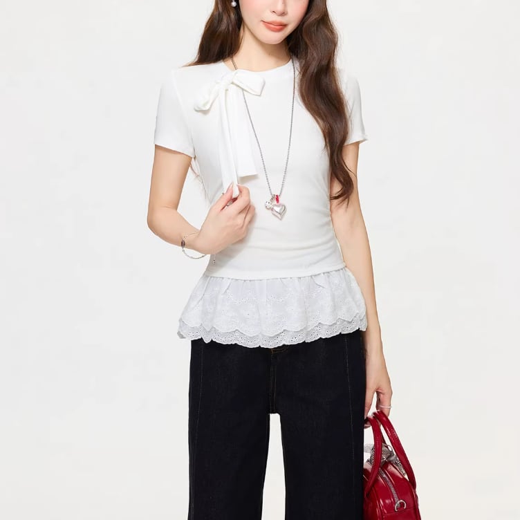 レースカラーアシメボタンドッキングトップス ・71106