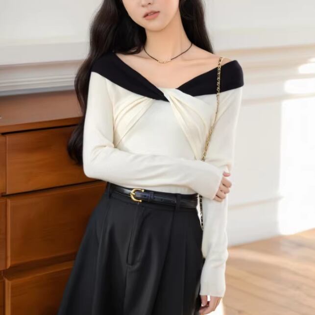 2色/フェイクレイヤードフーデッドニットトップス ・75335