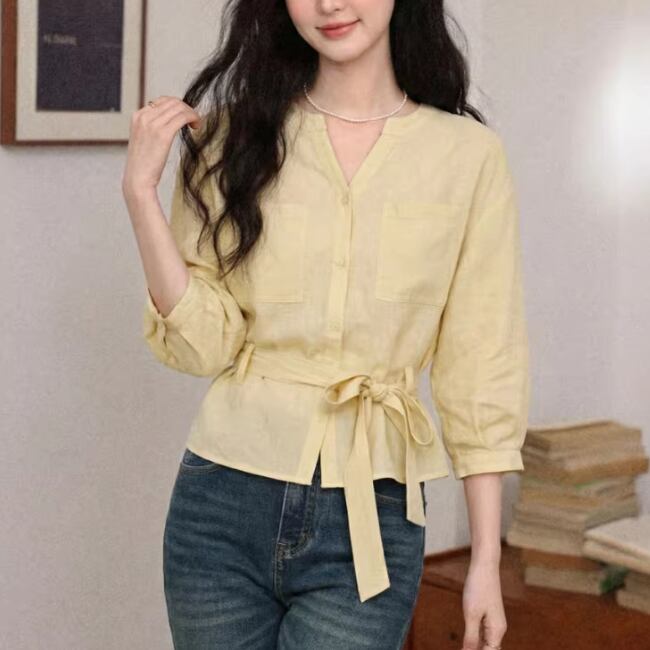 3色/ドロストリボンアシメデザインシャツ ・75363