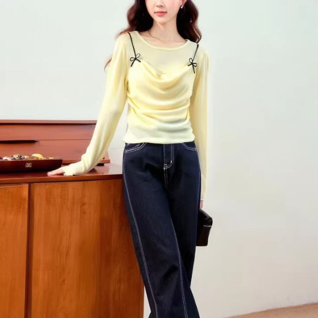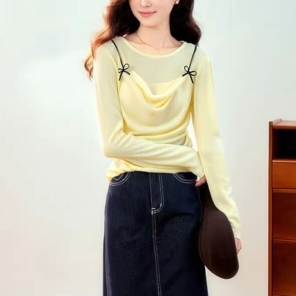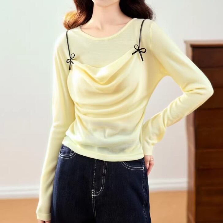 2色/フェイクレイヤードフーデッドニットトップス ・75335