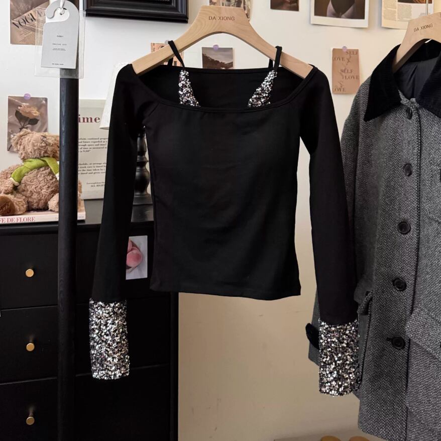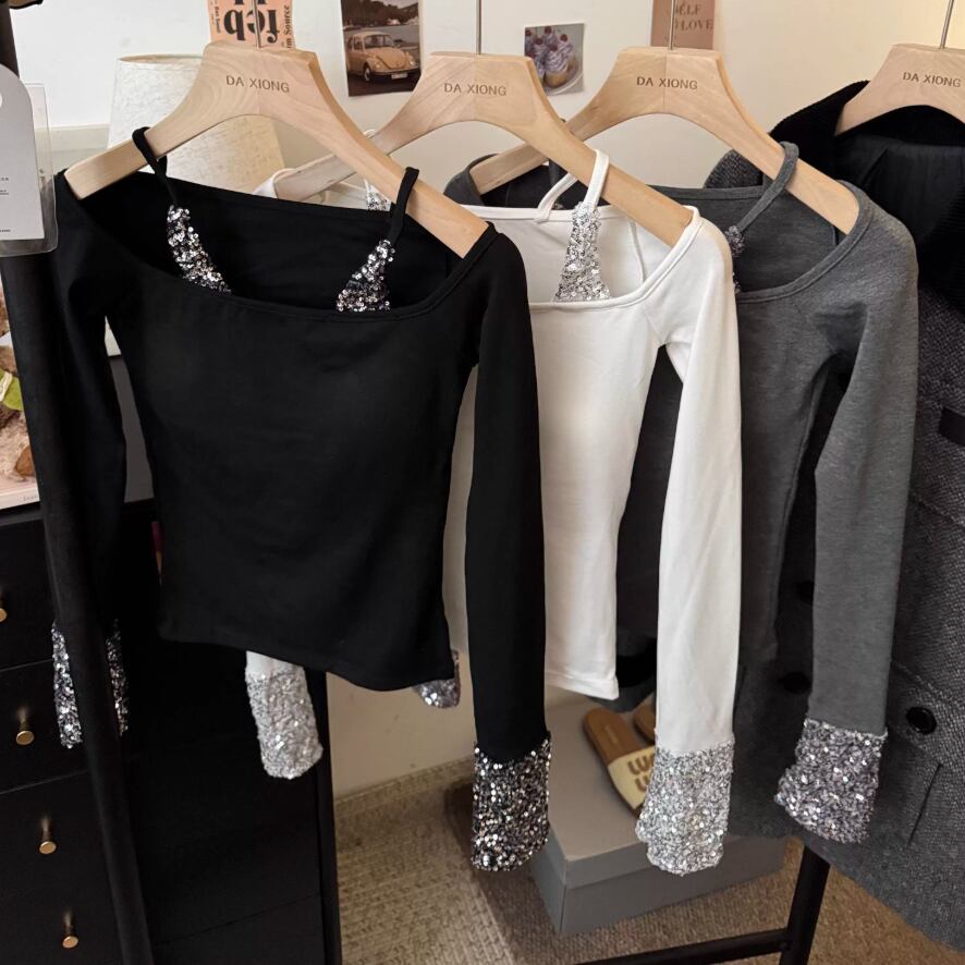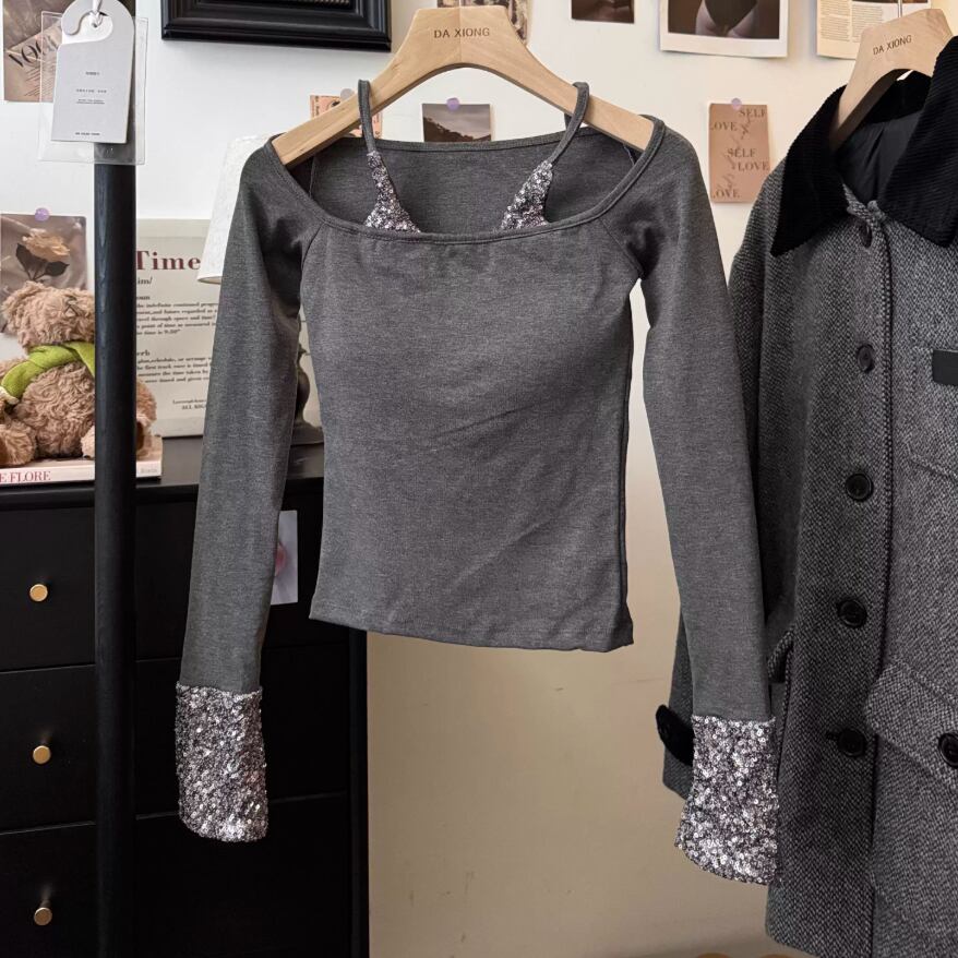 2色/フェイクレイヤードフーデッドニットトップス ・75335