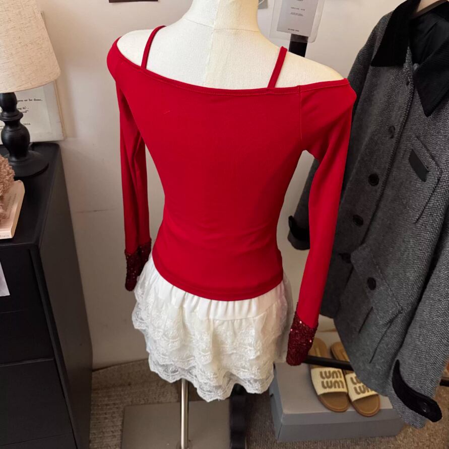 レースカラーアシメボタンドッキングトップス ・71106