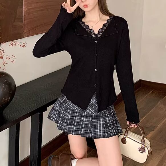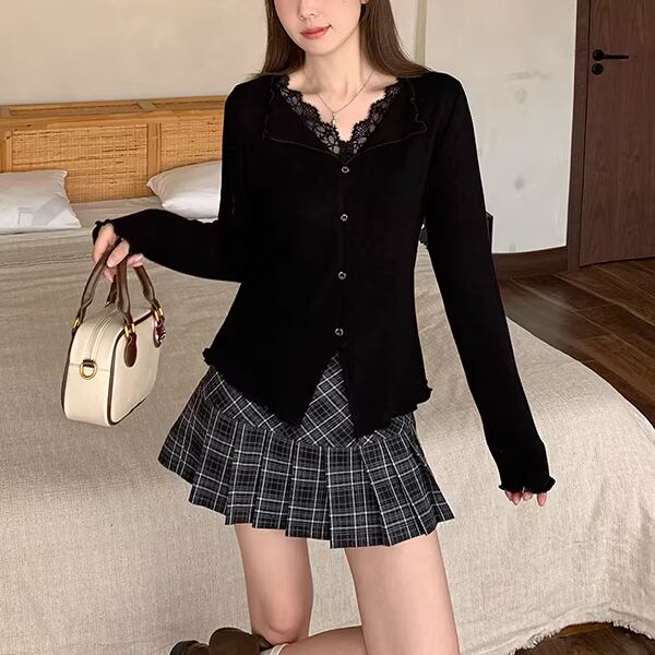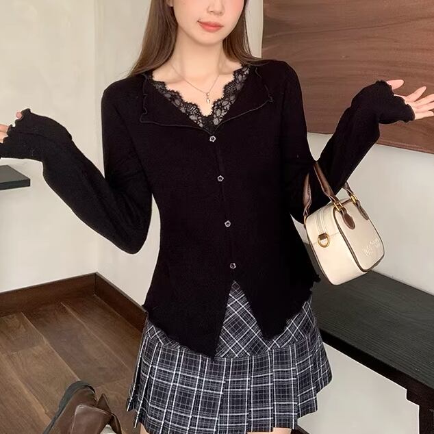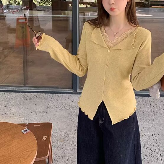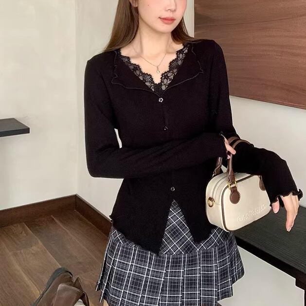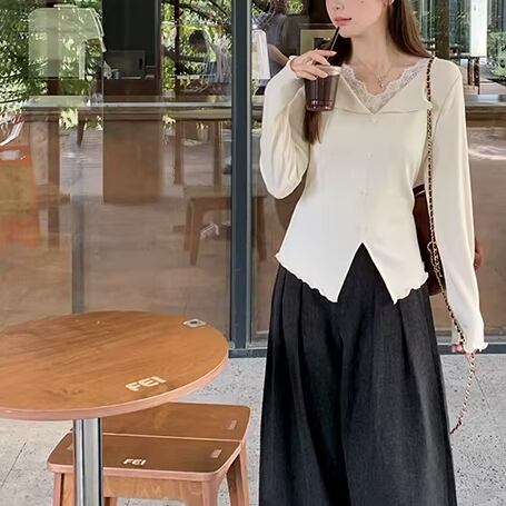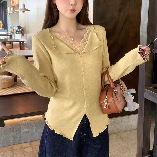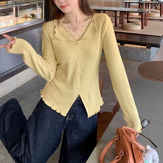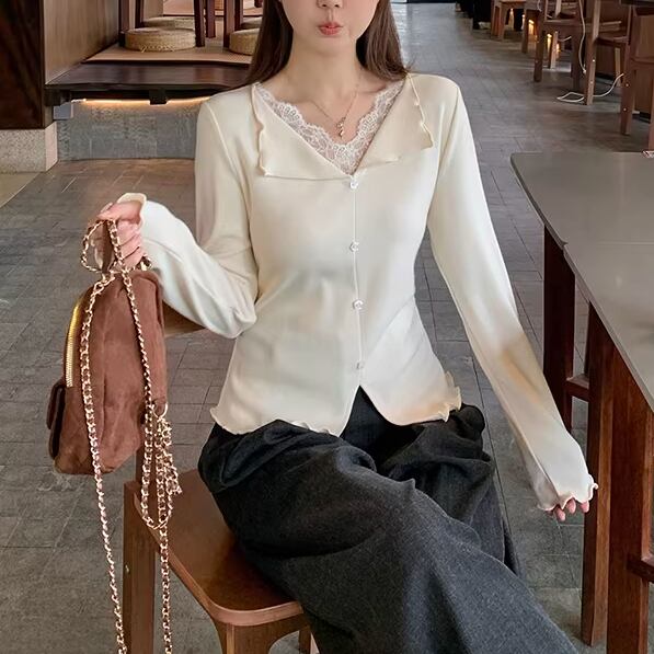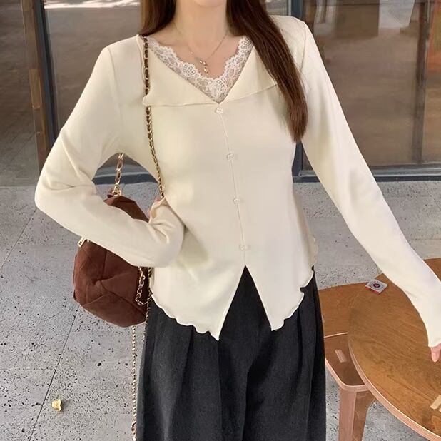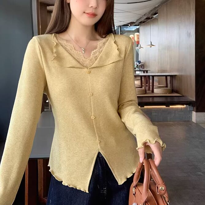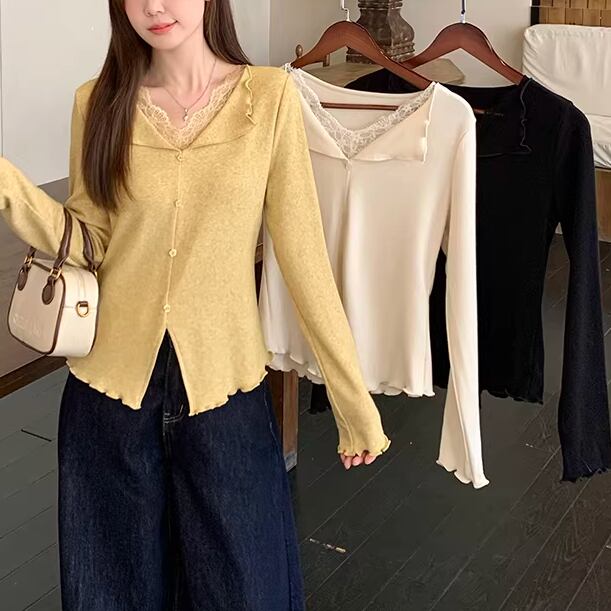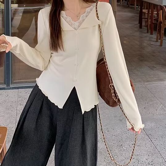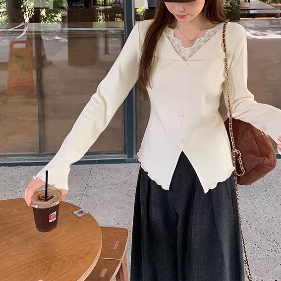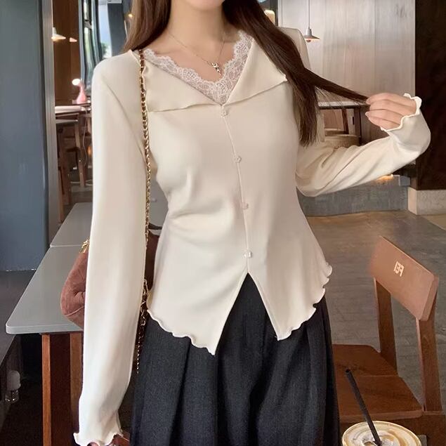 レースカラーアシメボタンドッキングトップス ・71106
