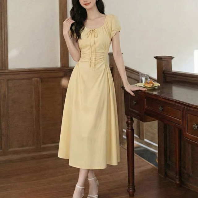4色/リボンギャザーネックパフスリーブワンピ ・75702