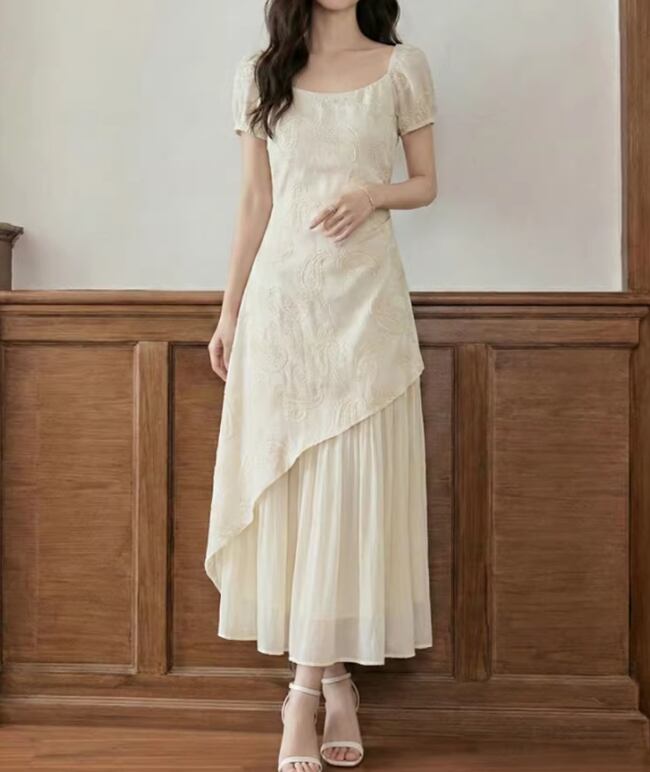 フレンチスリーブリボンネック刺繍ワンピ ・75697