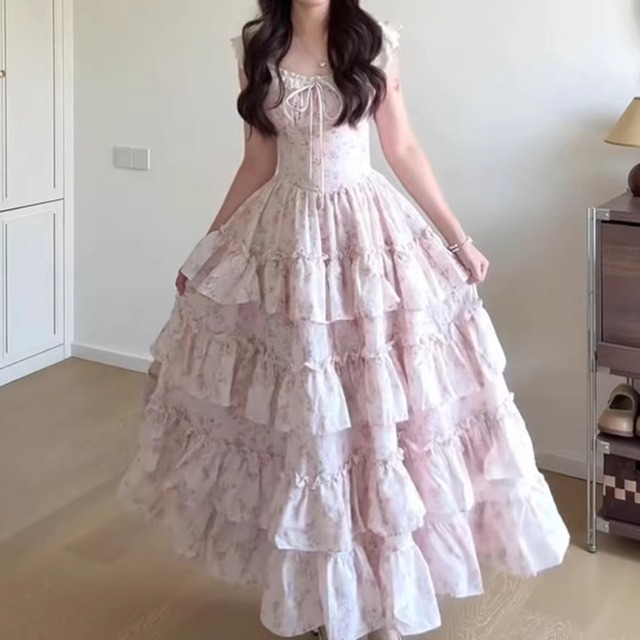 2色/フラワーボリュームフリルロングワンピ ・75634