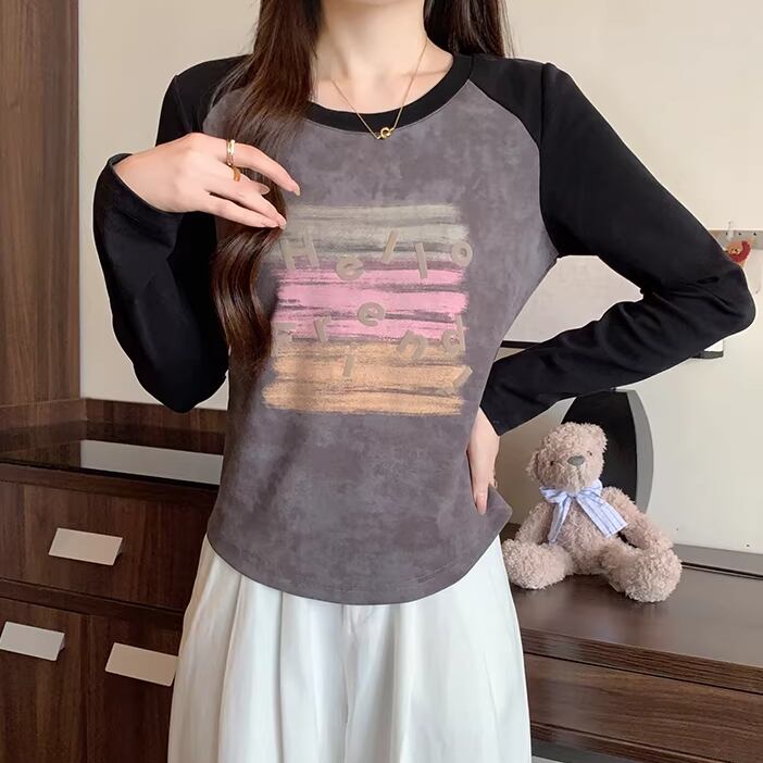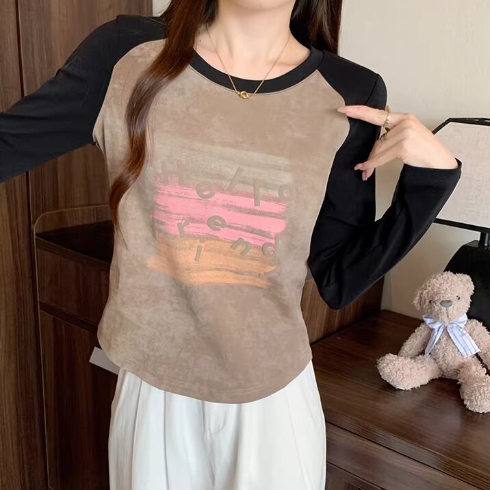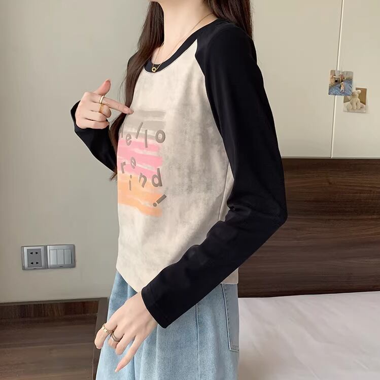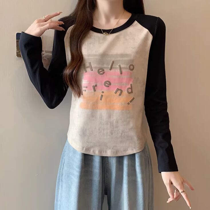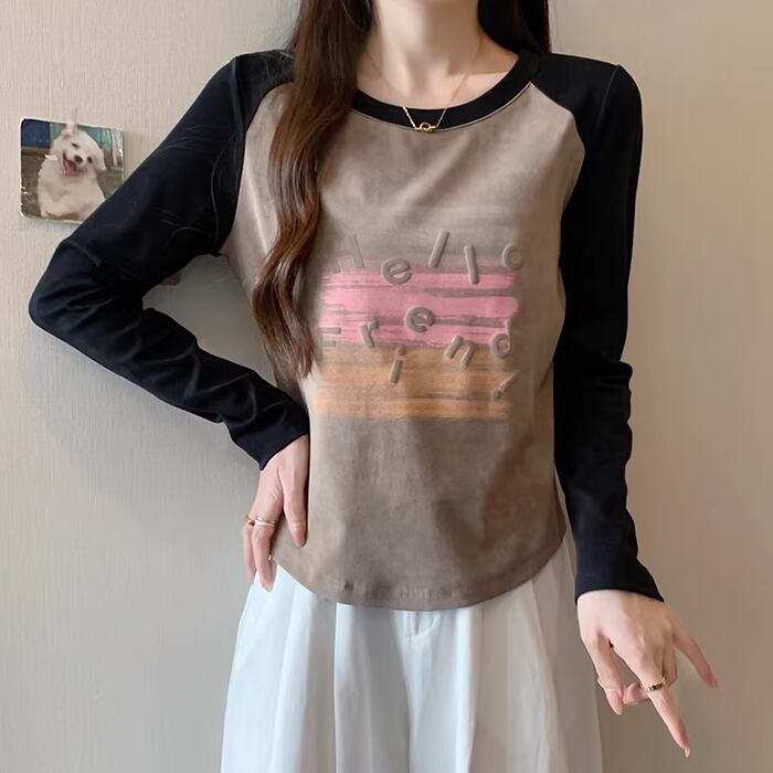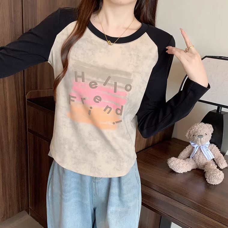 3色/配色カラーカレッジロゴプリントトップス ・75615