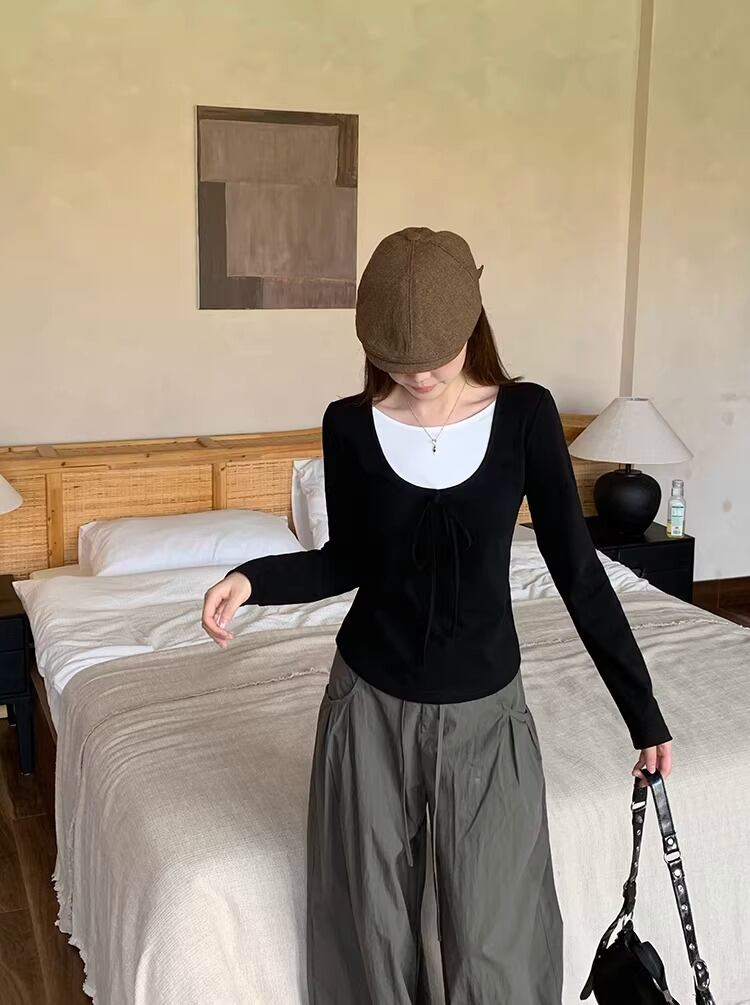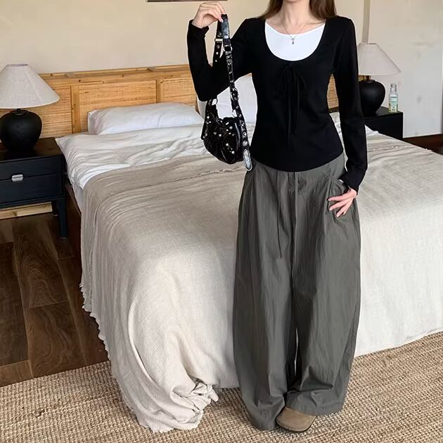 【2点セット】2色/配色スキッパーカラートップス+ワイドパンツ ・75596