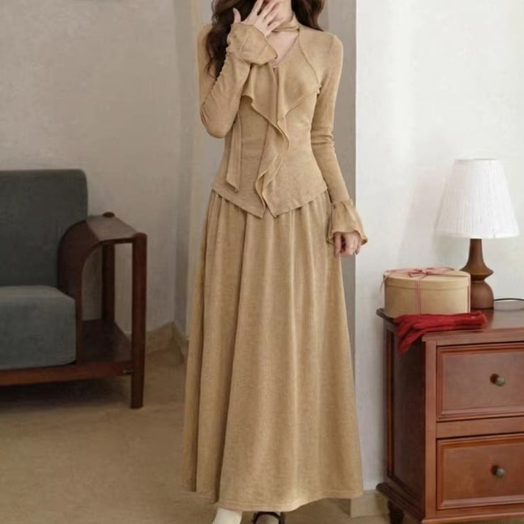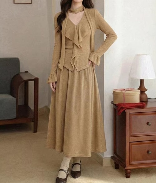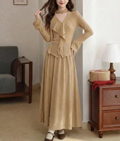 【2点セット】3色/パールデコフリルオフショルセーター+ニットミニスカート ・73703