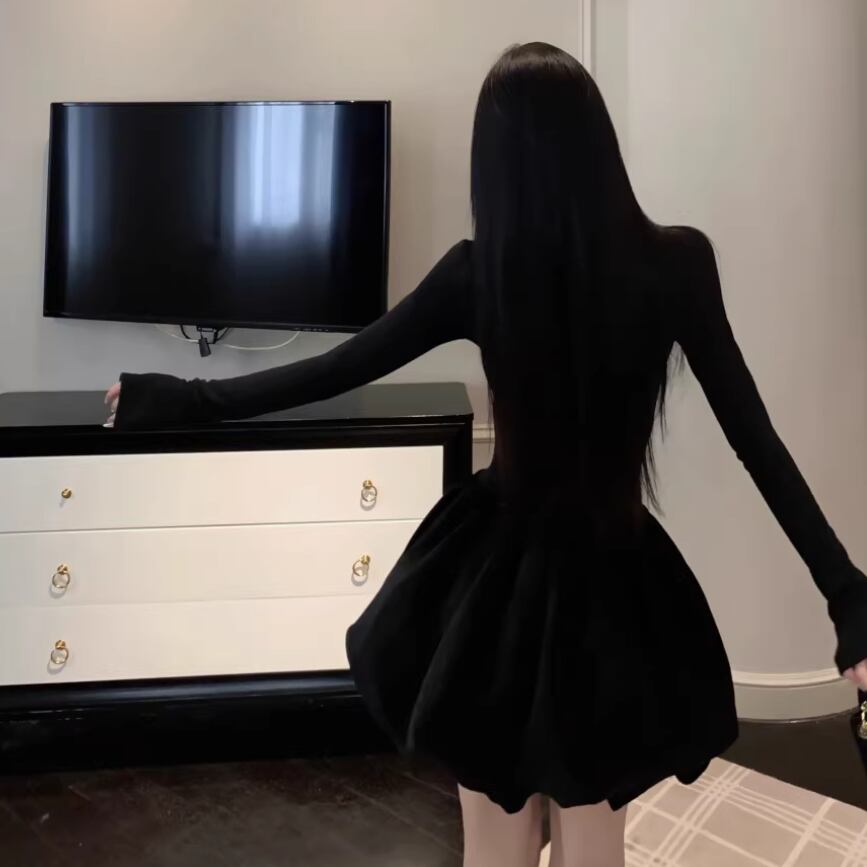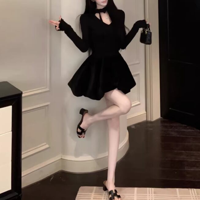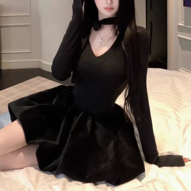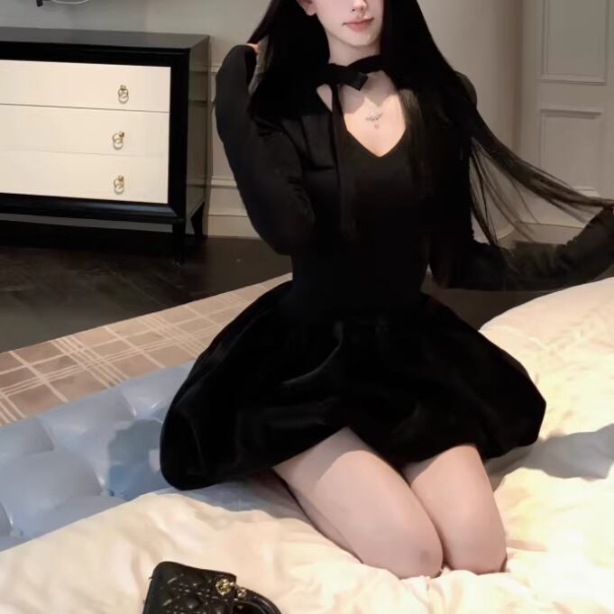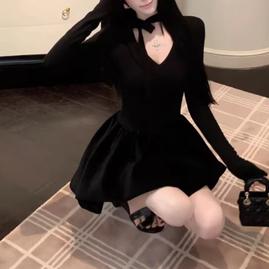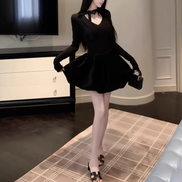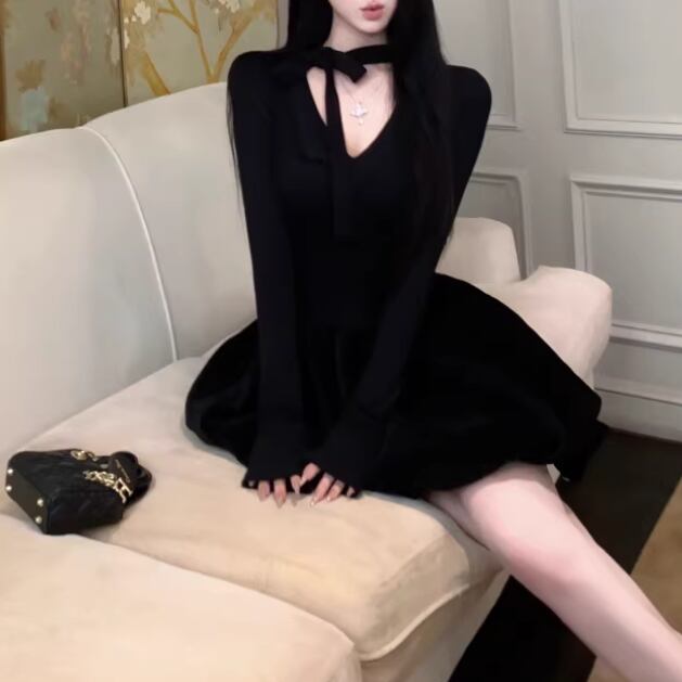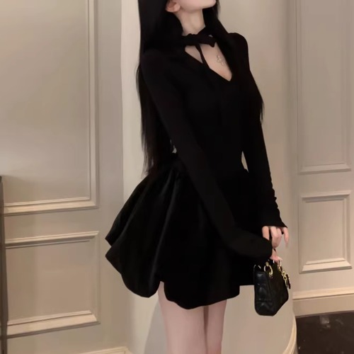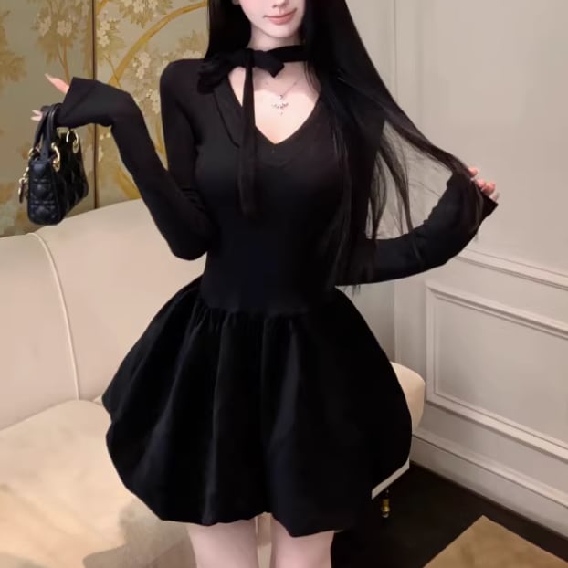2色/チュールフラワーフリルネックボウタイワンピ ・54889