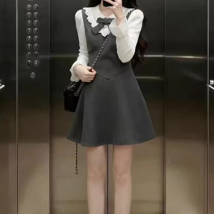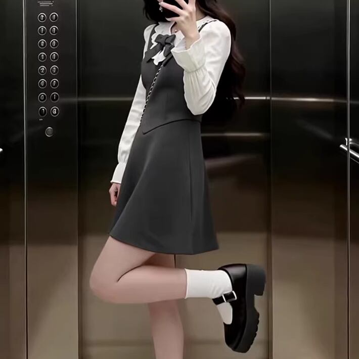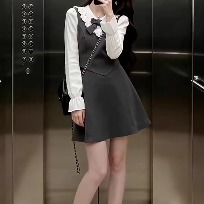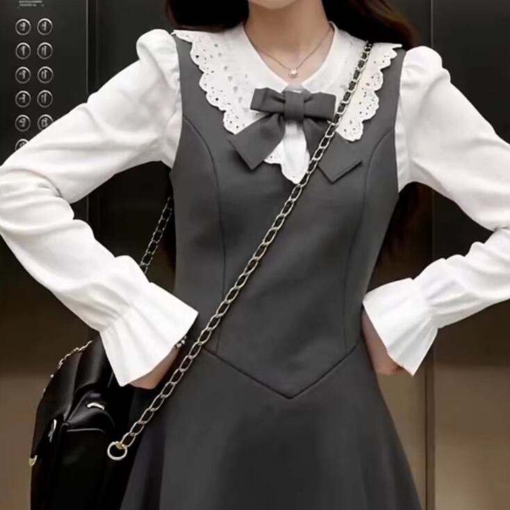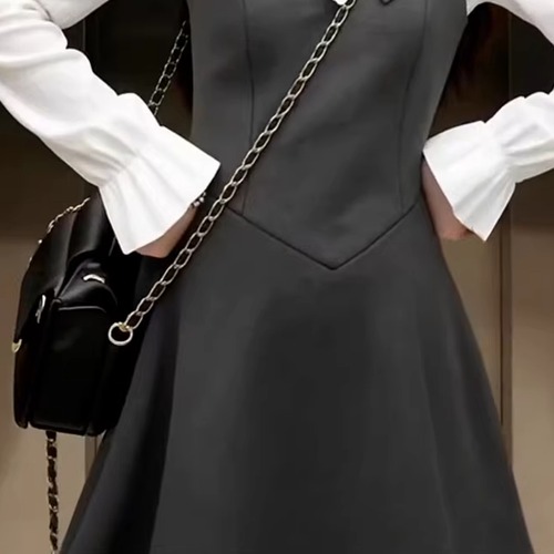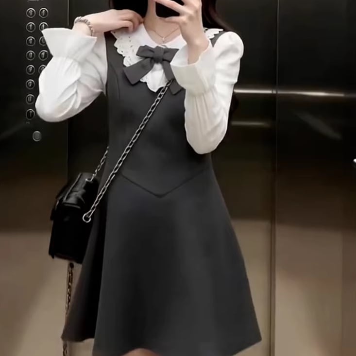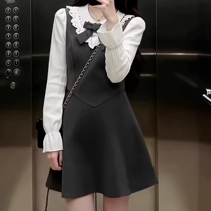 2色/チュールフラワーフリルネックボウタイワンピ ・54889