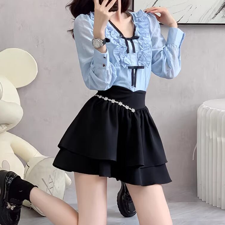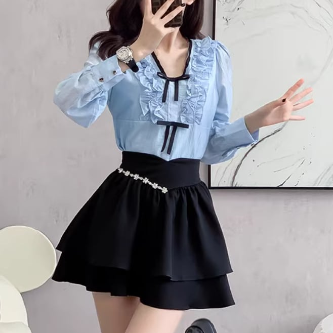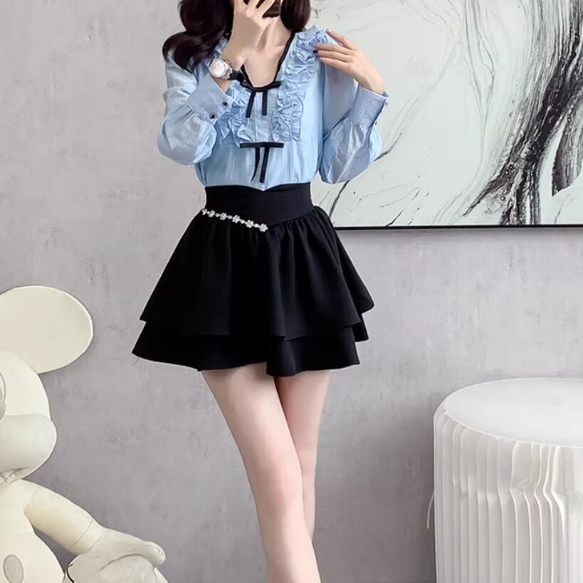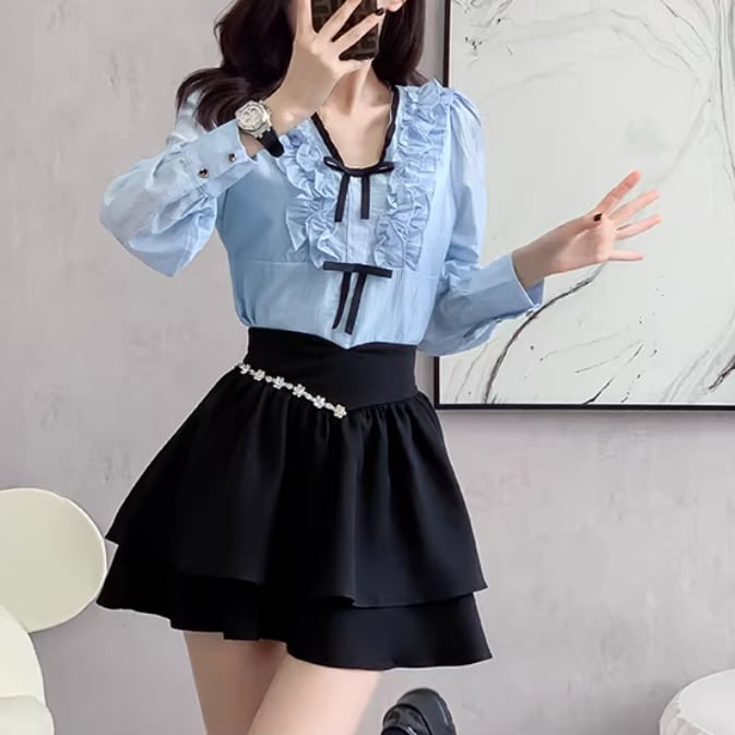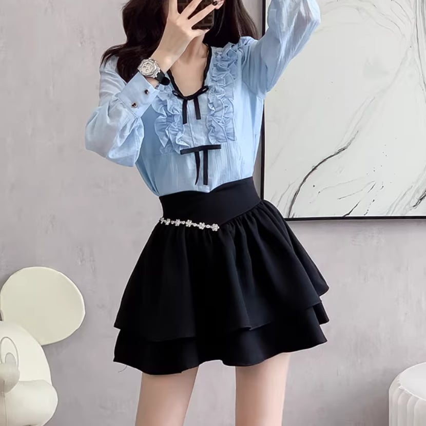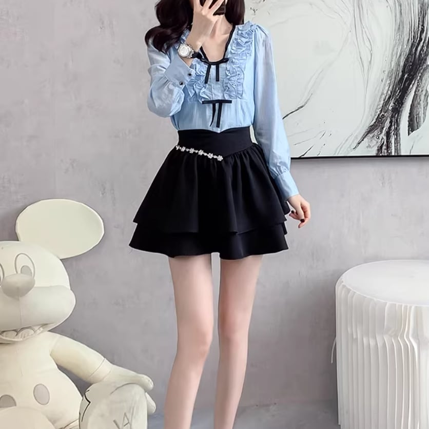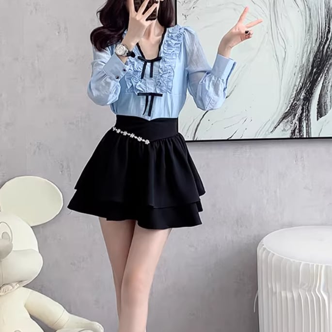 【2点セット】ストライプフライングスリーブシャツ+ハイウエストバルーンミニスカ ・69972