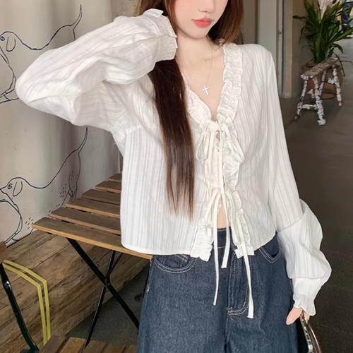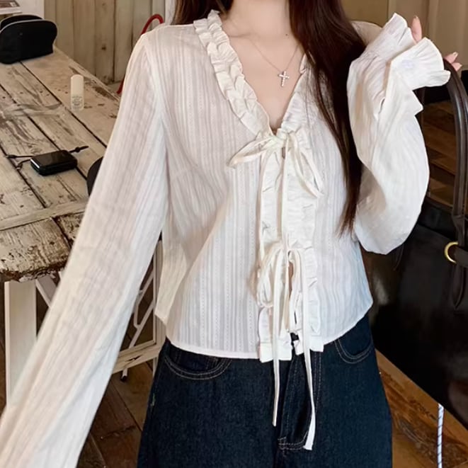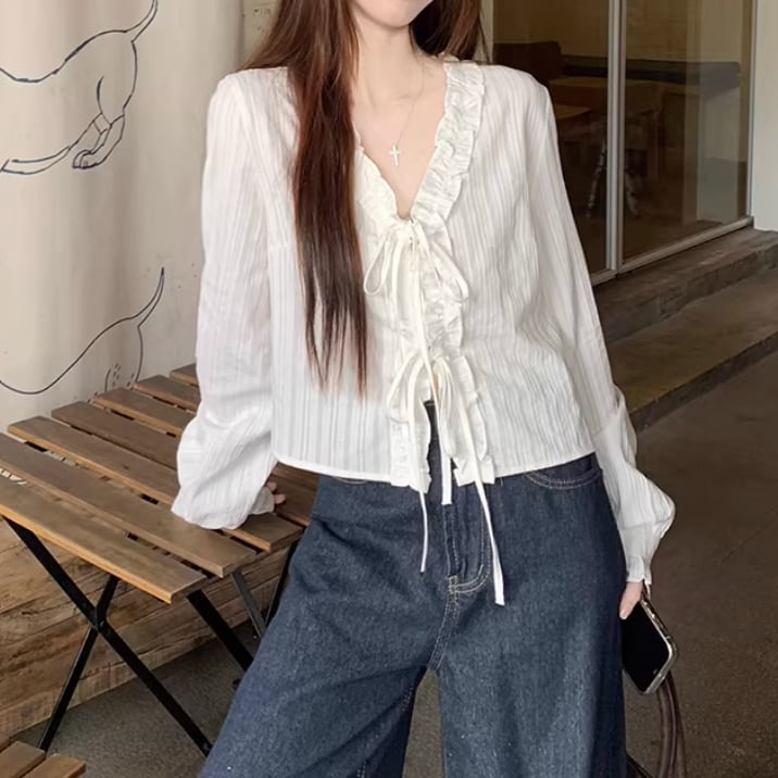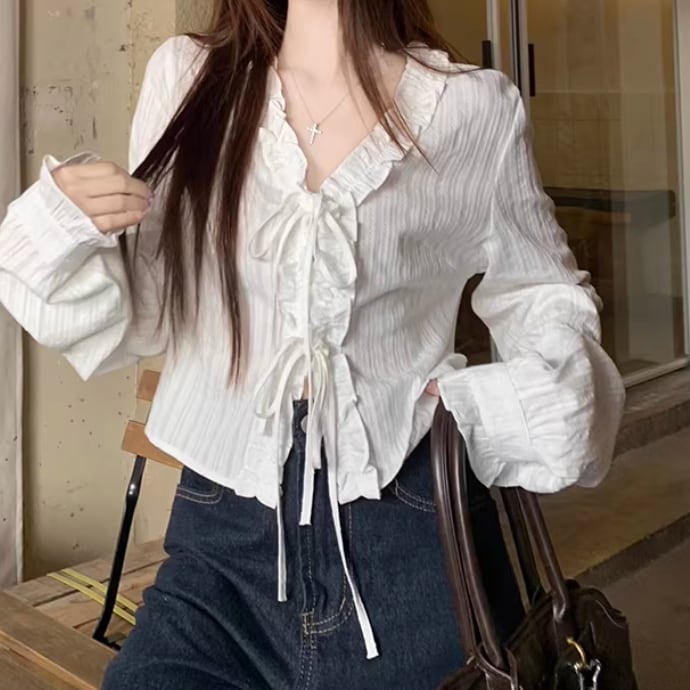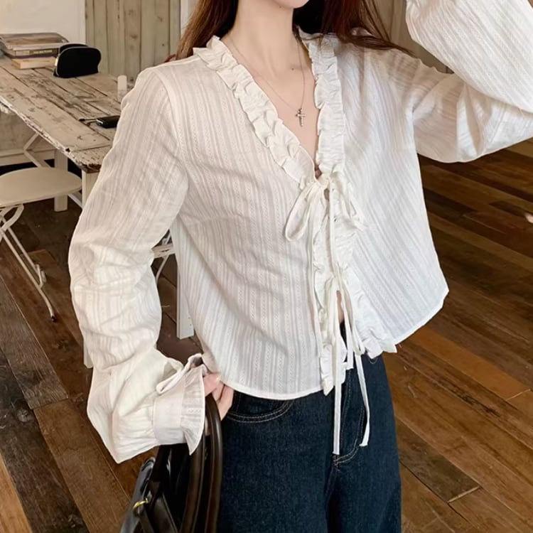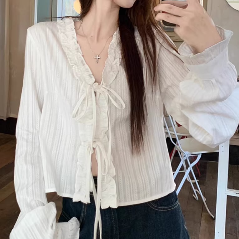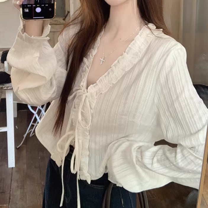 Vネックレースラッフルブラウス ・75382