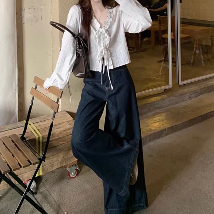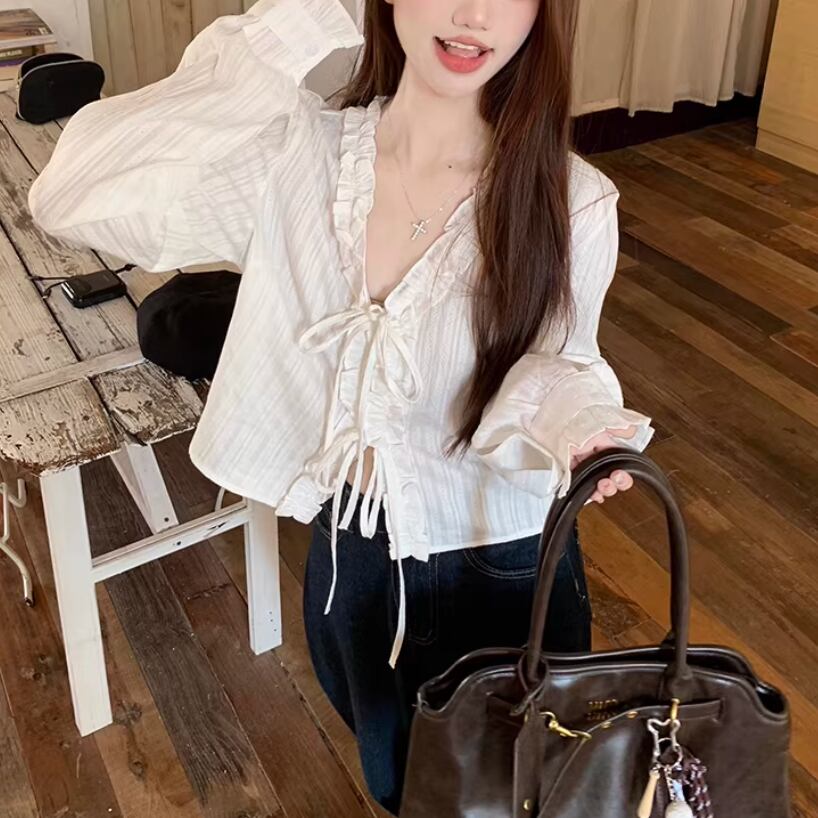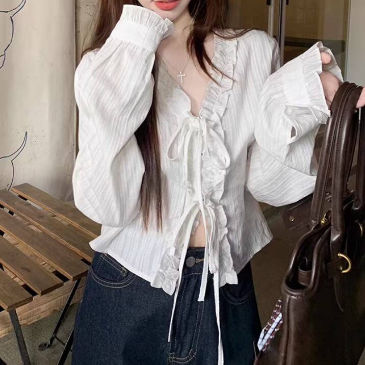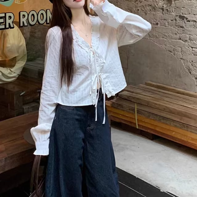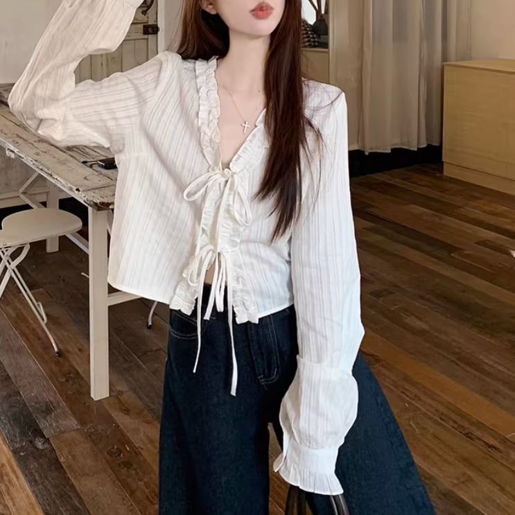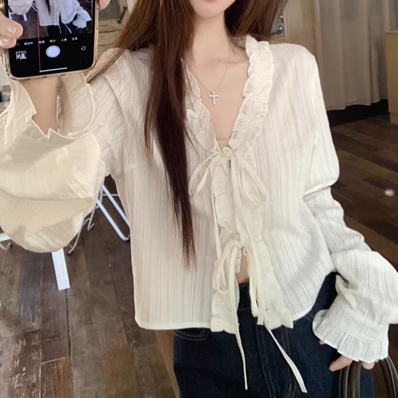 Vネックレースラッフルブラウス ・75382