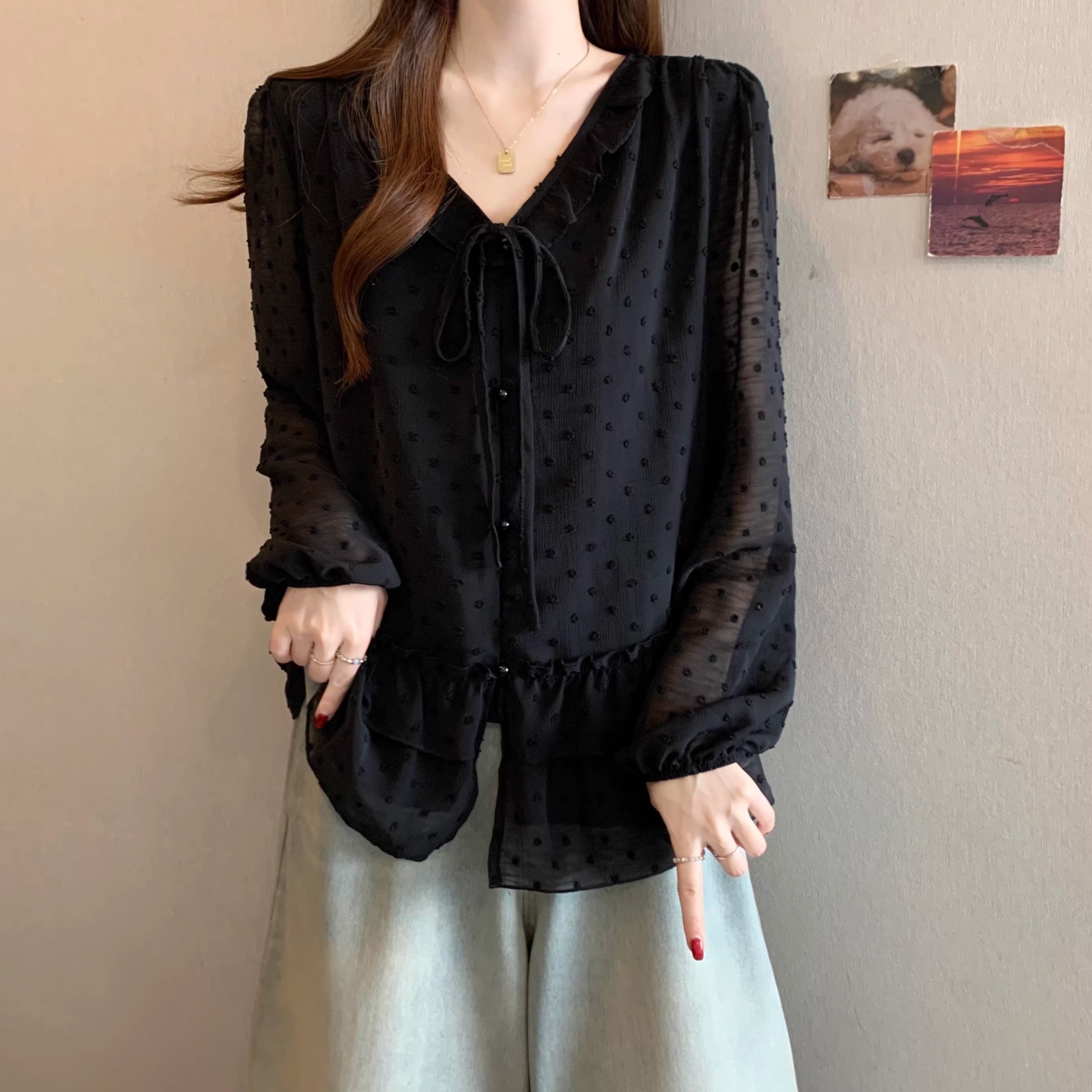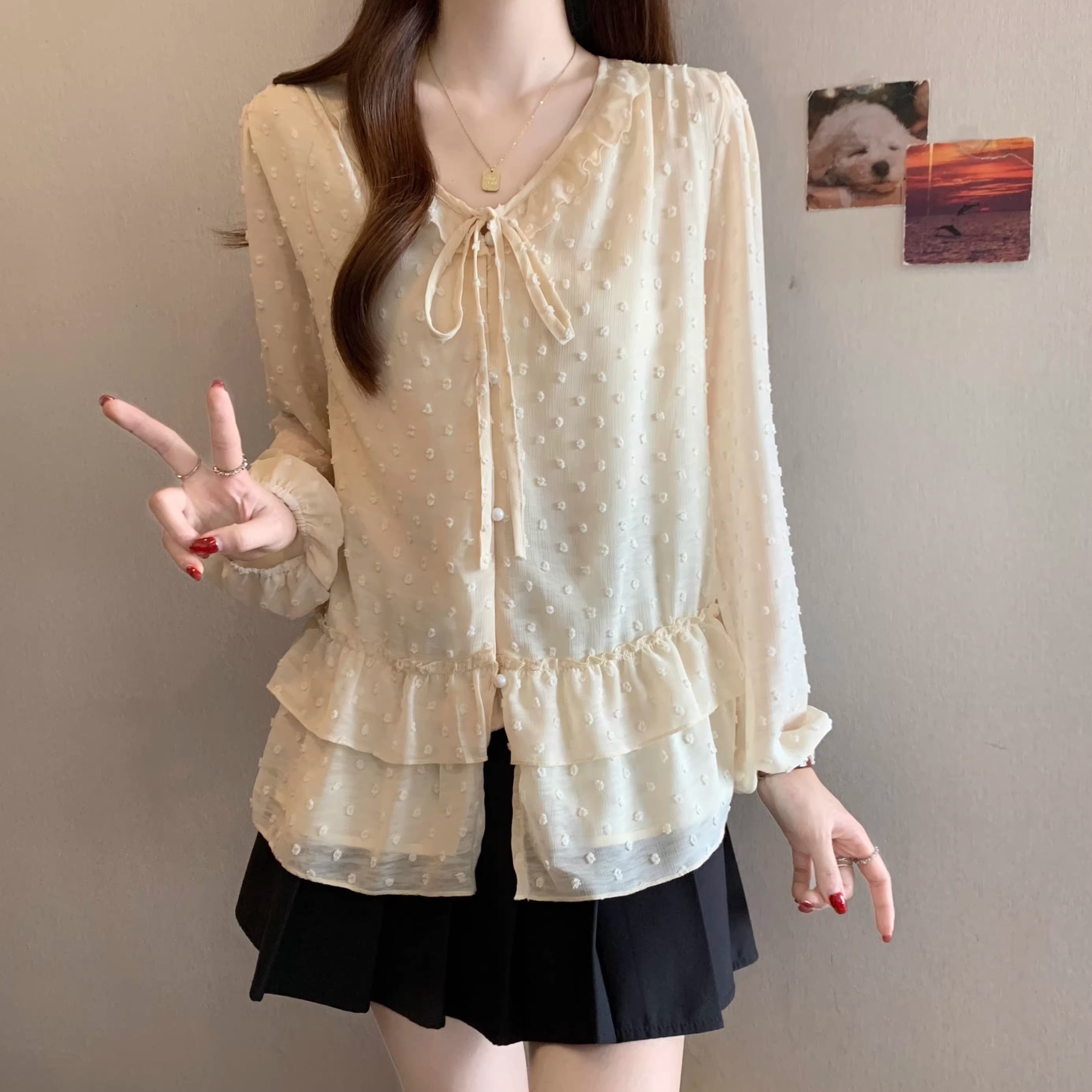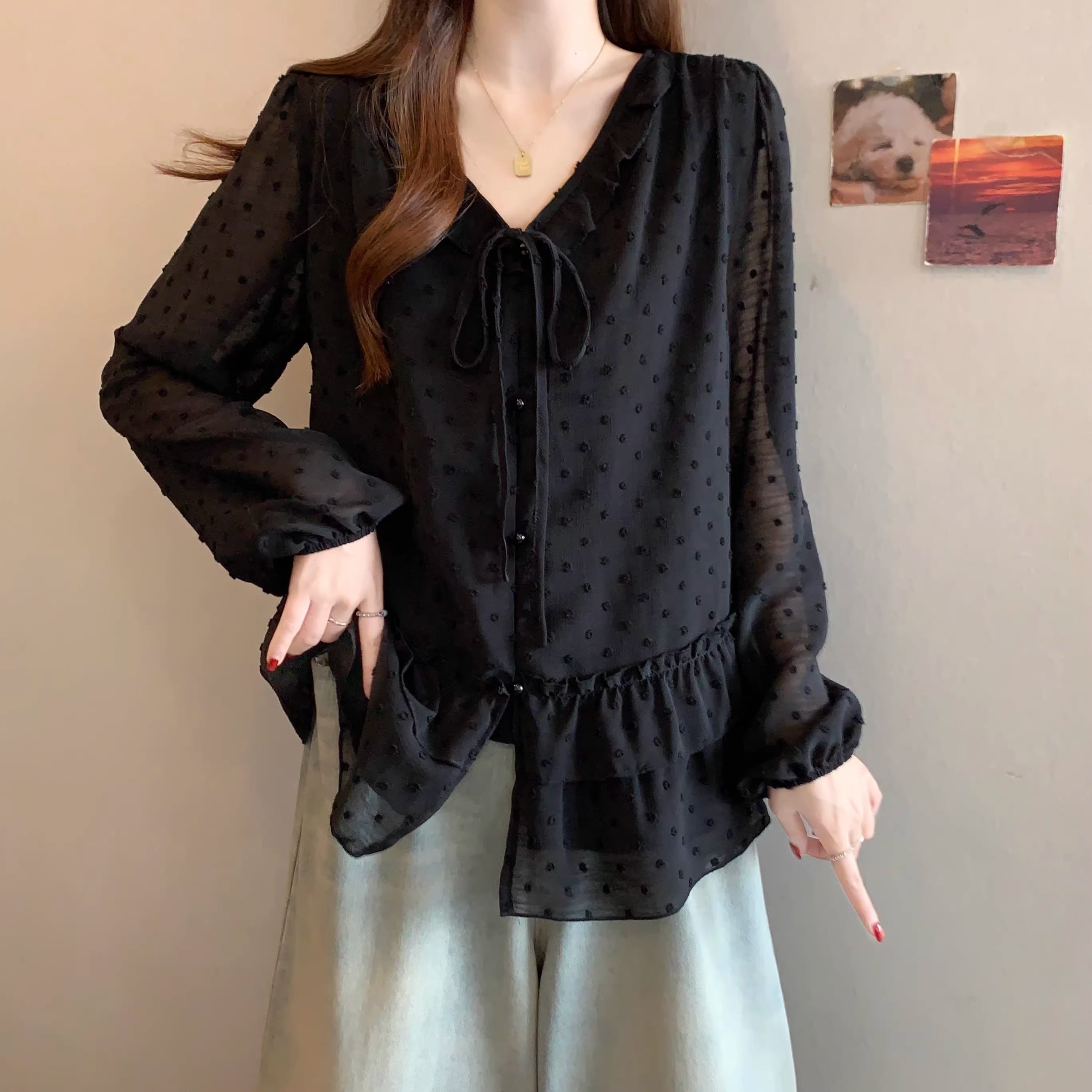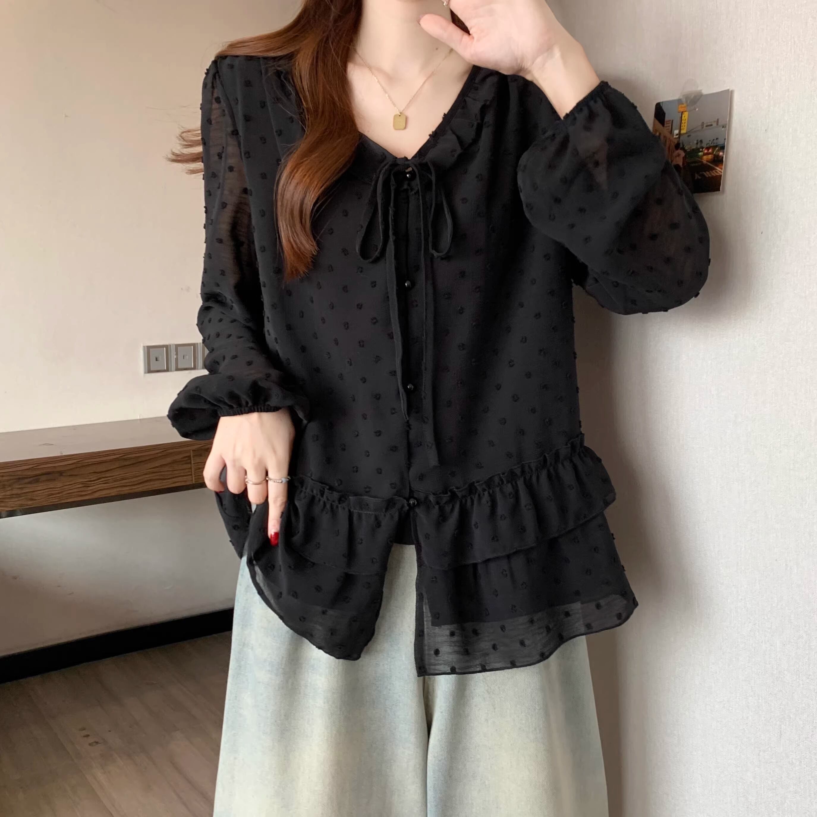 Vネックフリルリボンブラウス ・75996