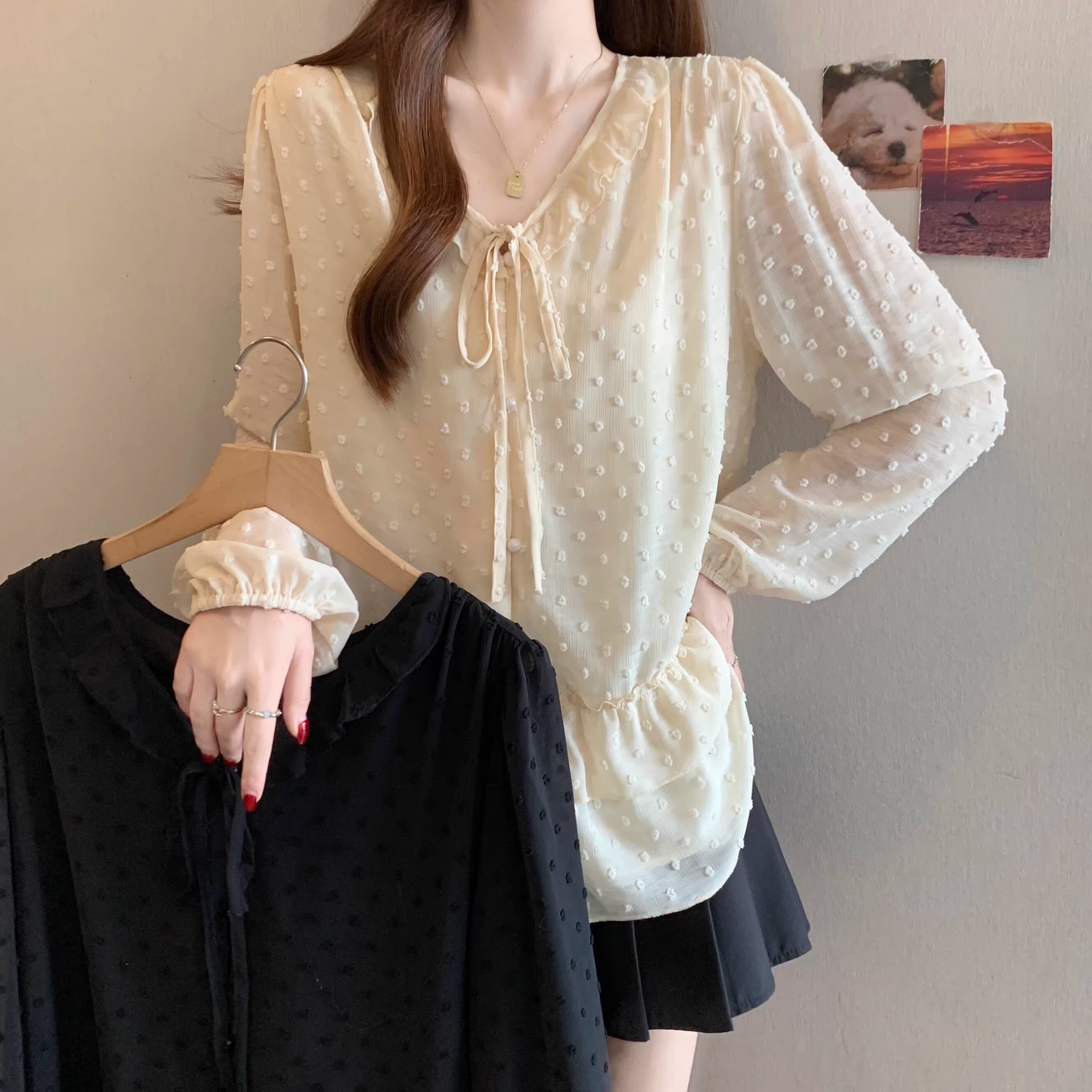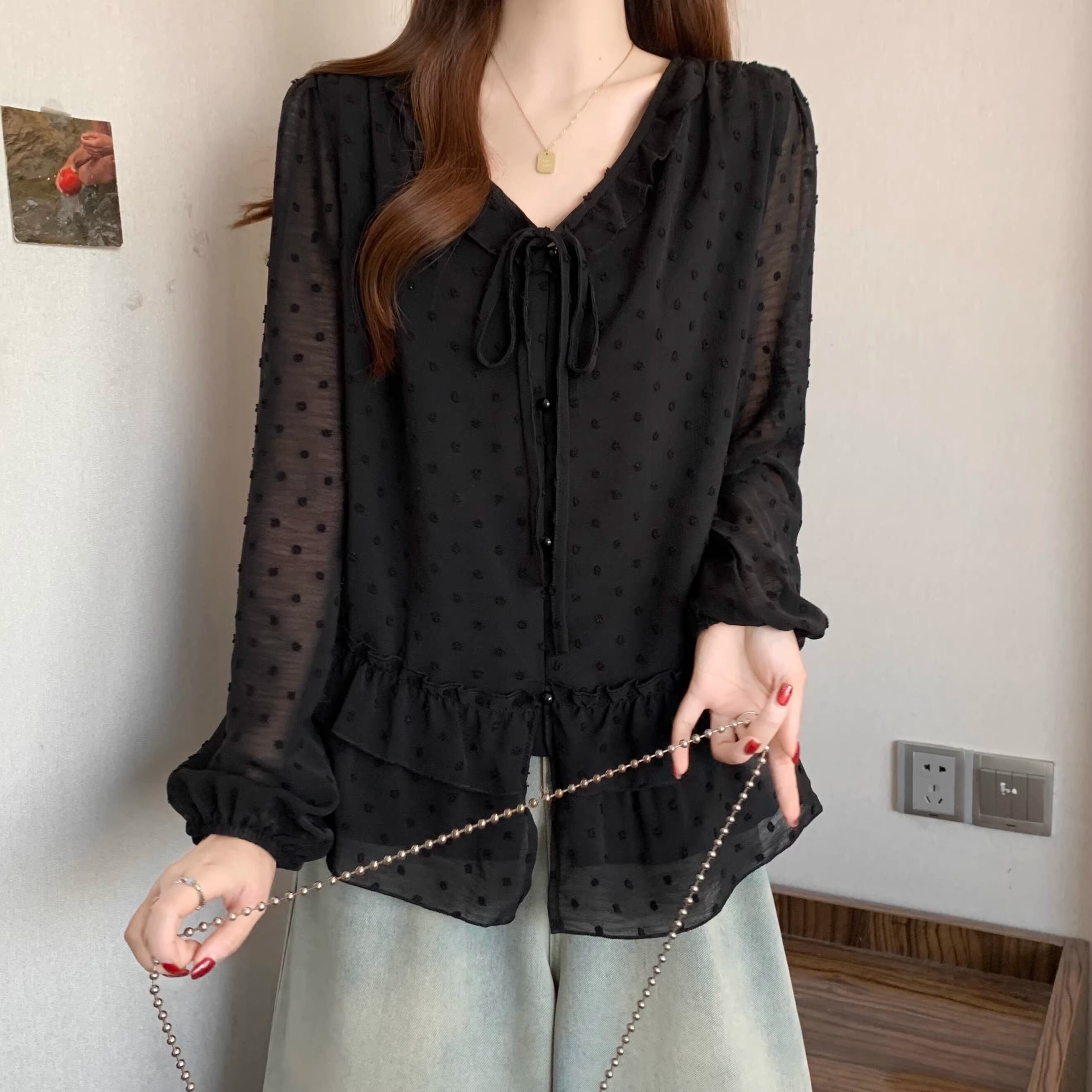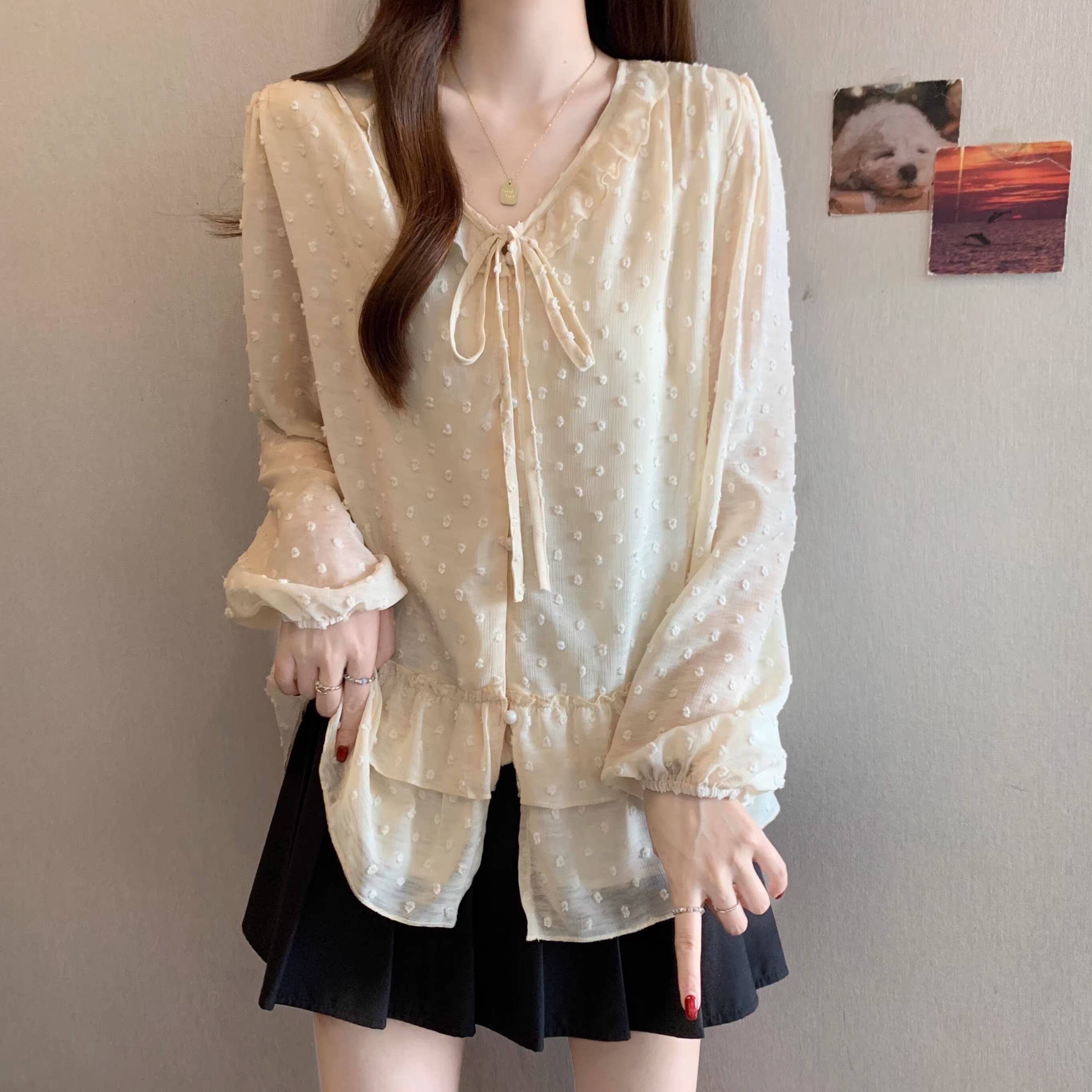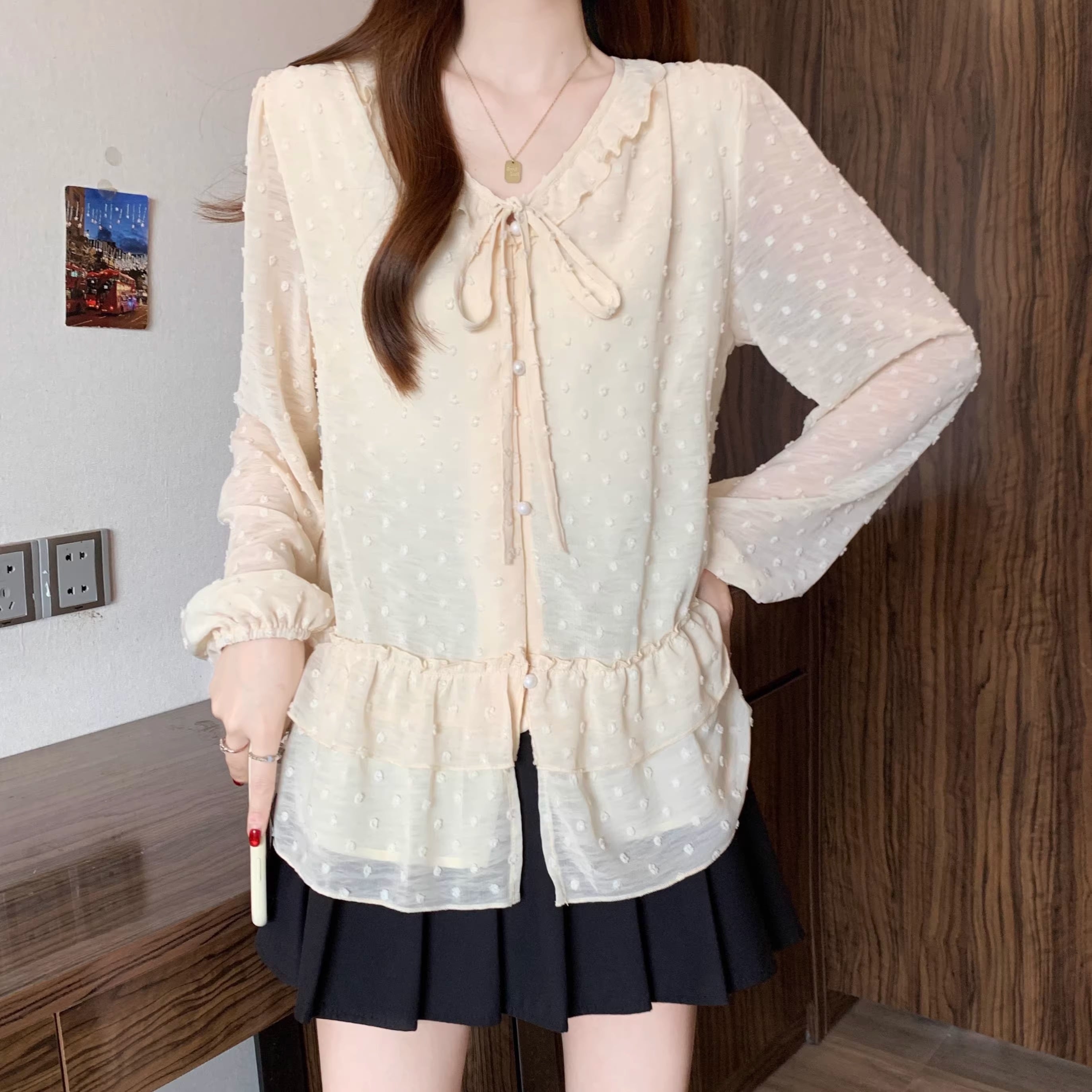Vネックフリルリボンブラウス ・75996