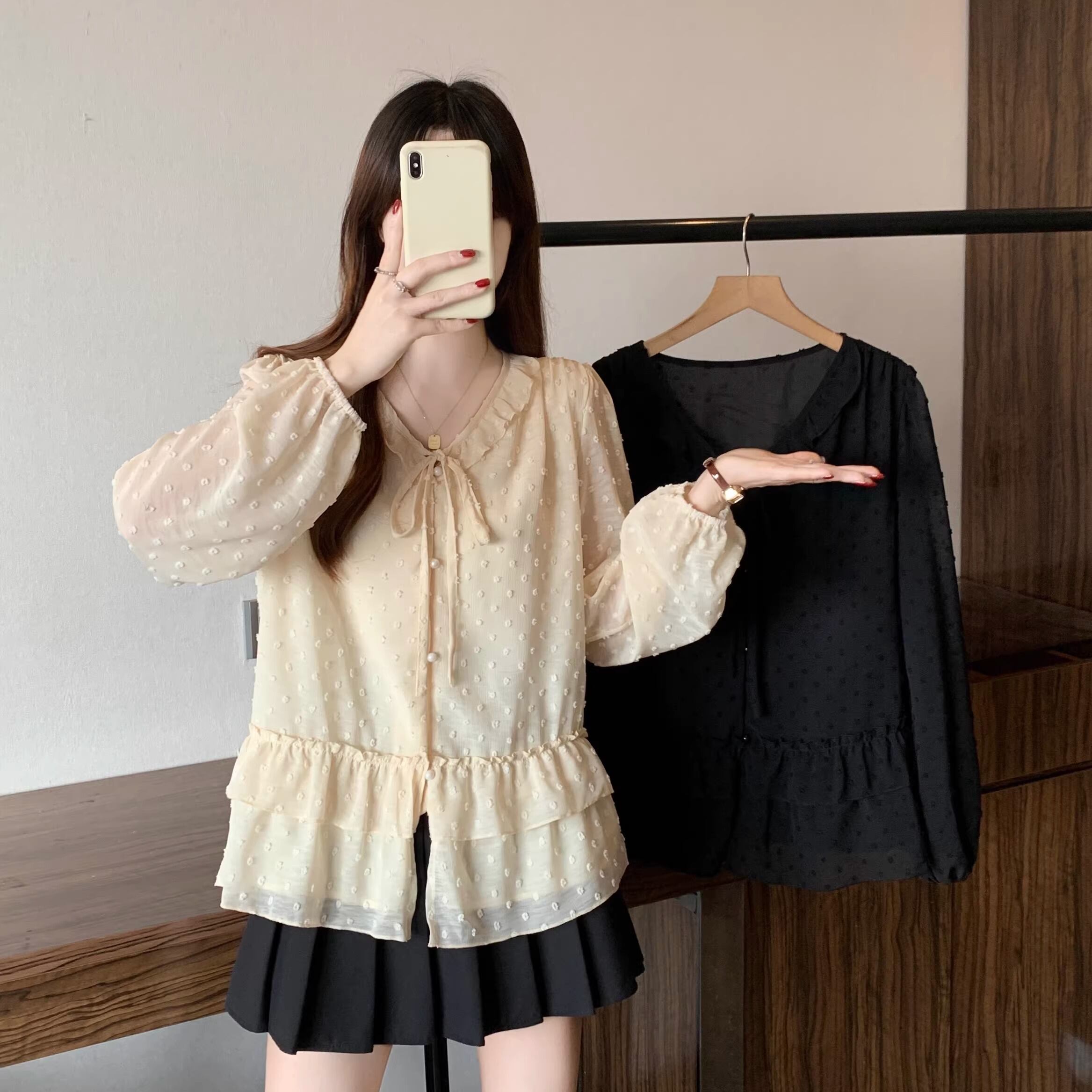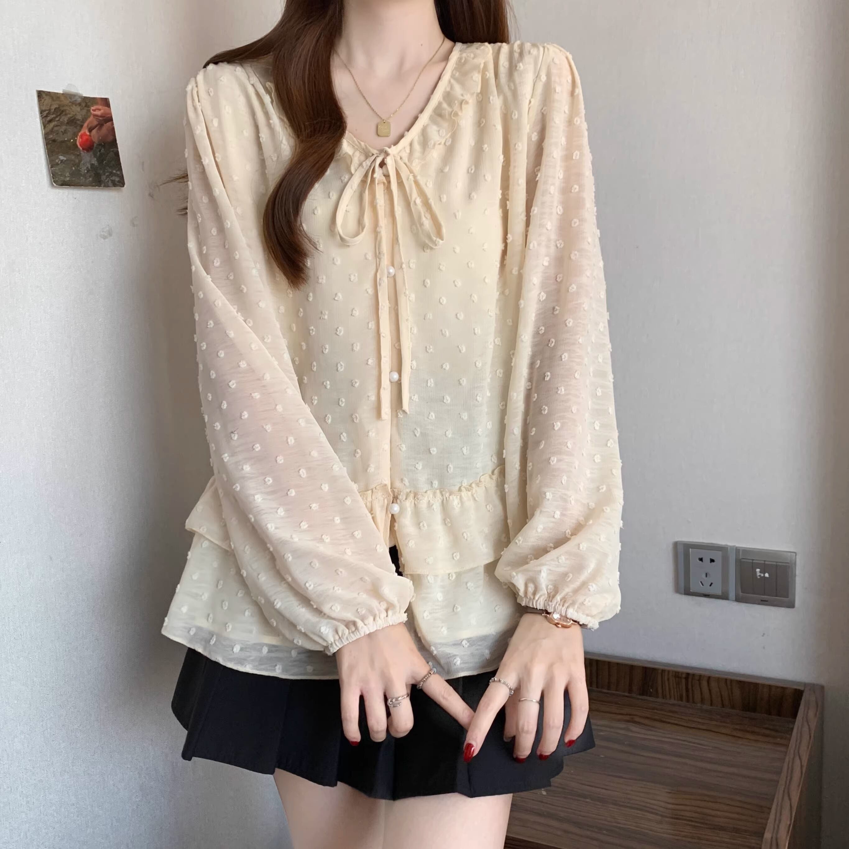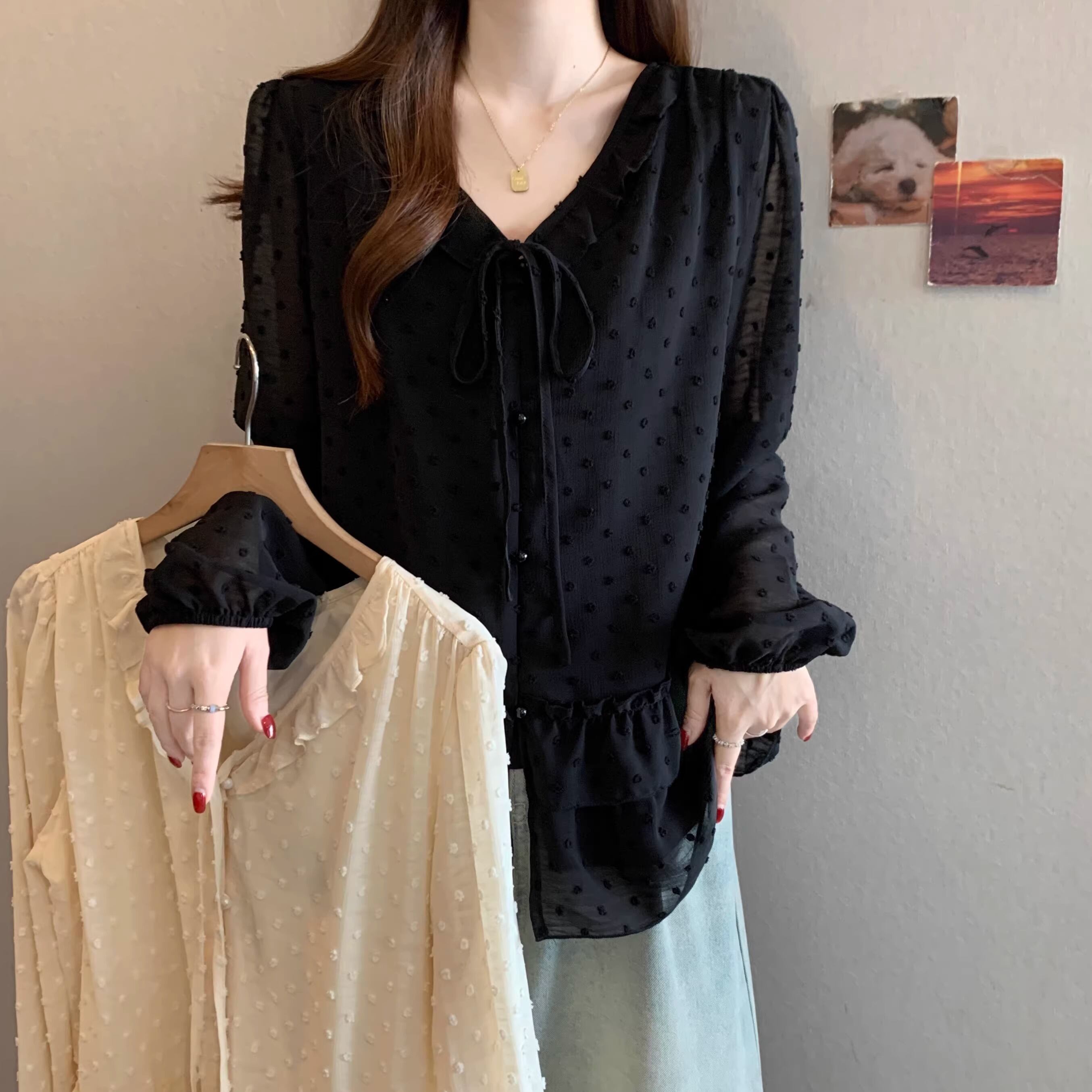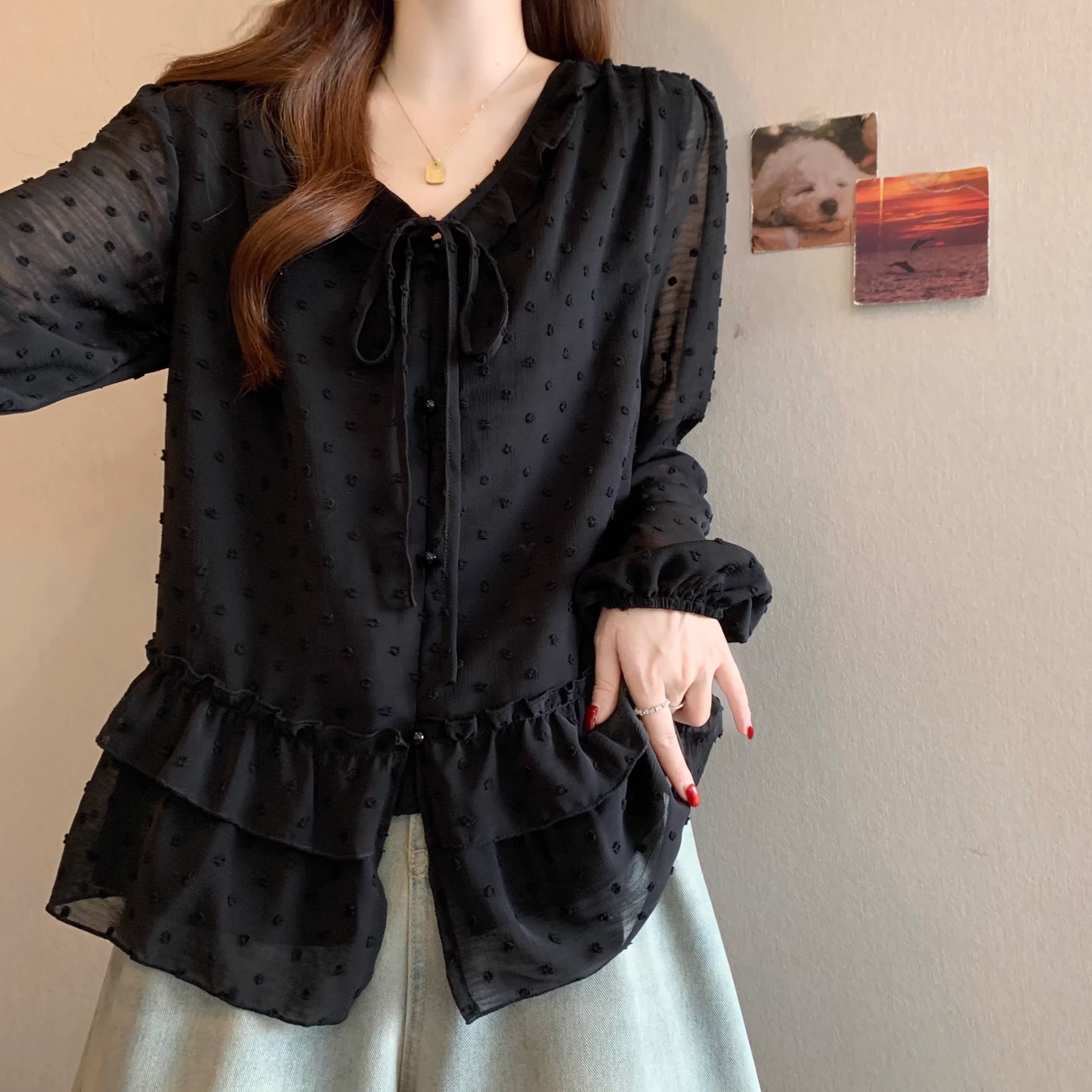 Vネックフリルリボンブラウス ・75996