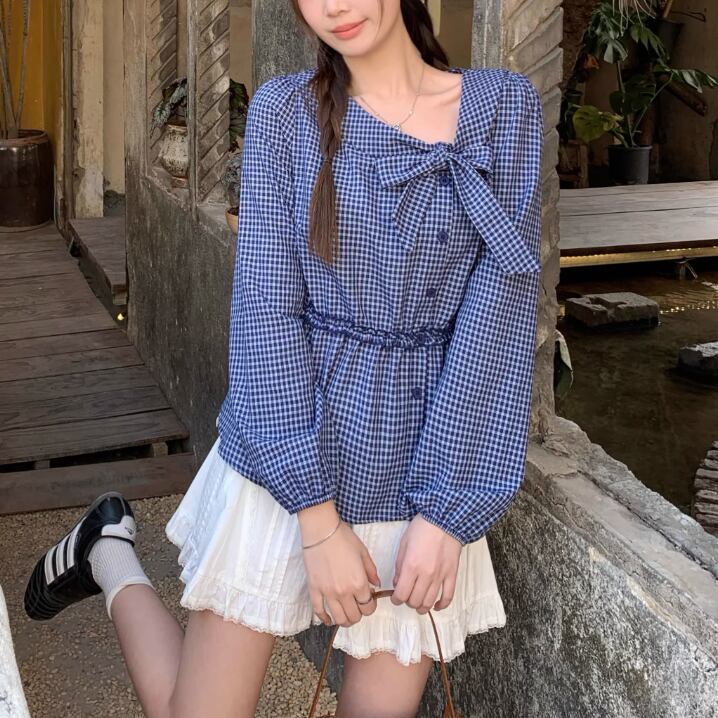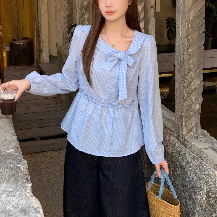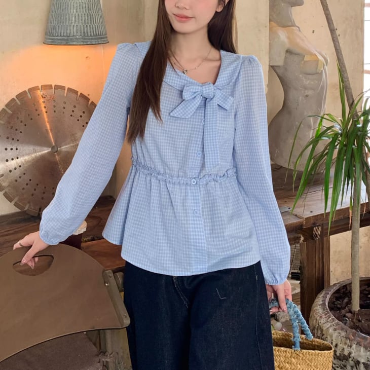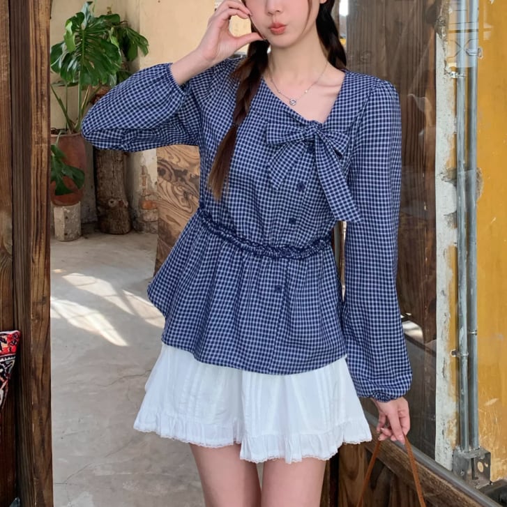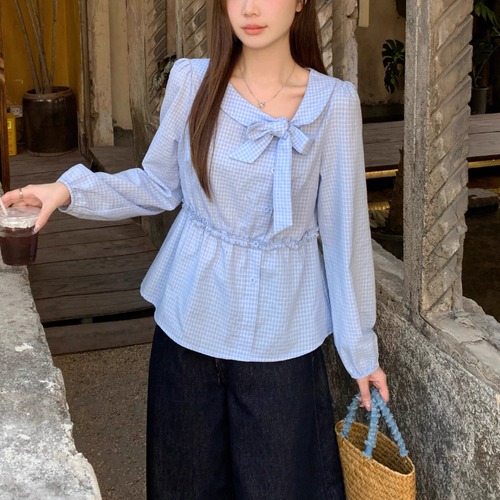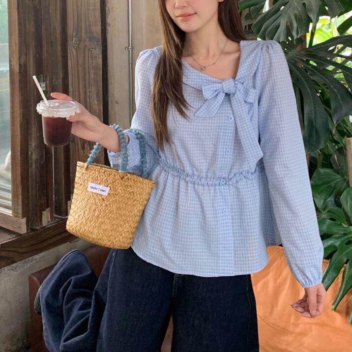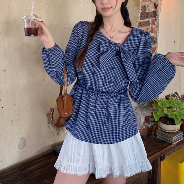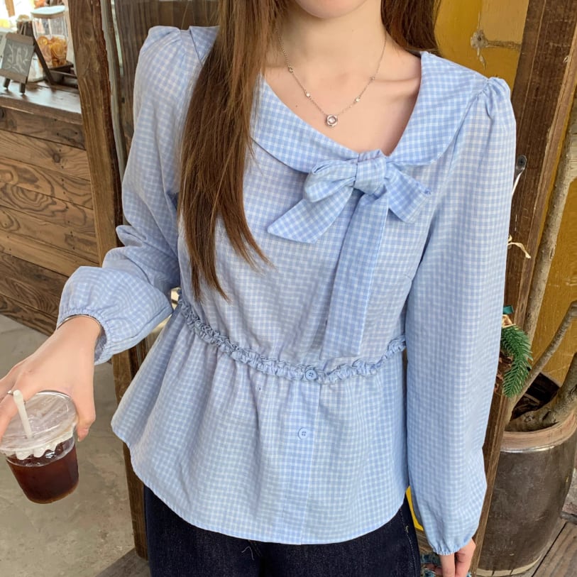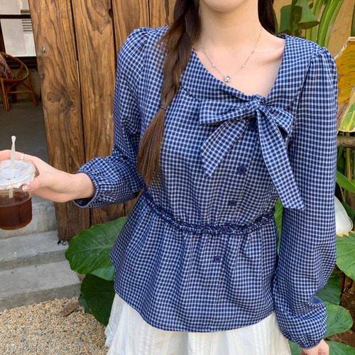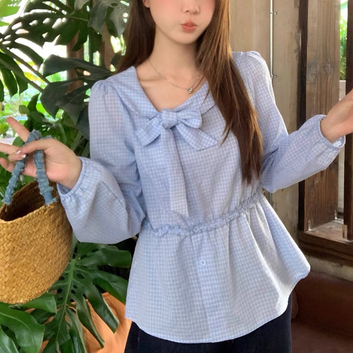 Vネックフリルリボンブラウス ・75996