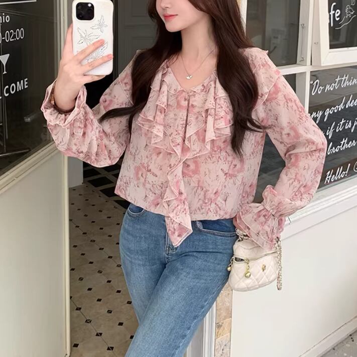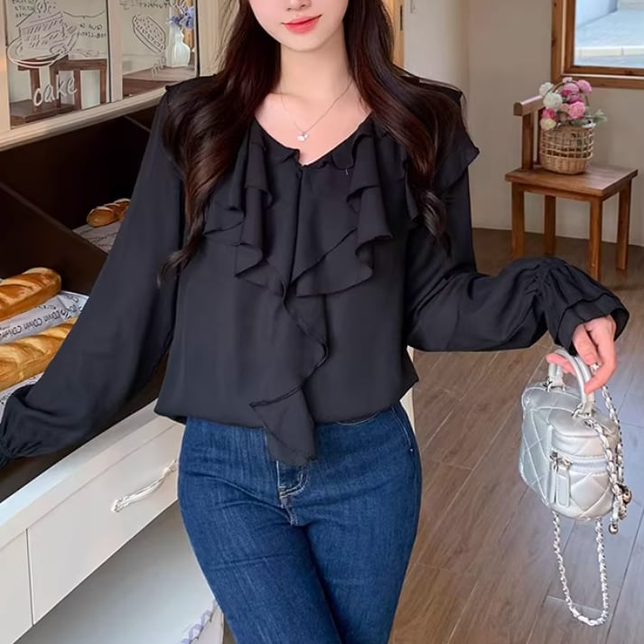 Vネックフリルリボンブラウス ・75996