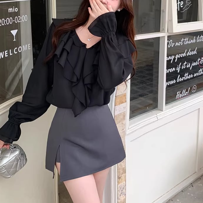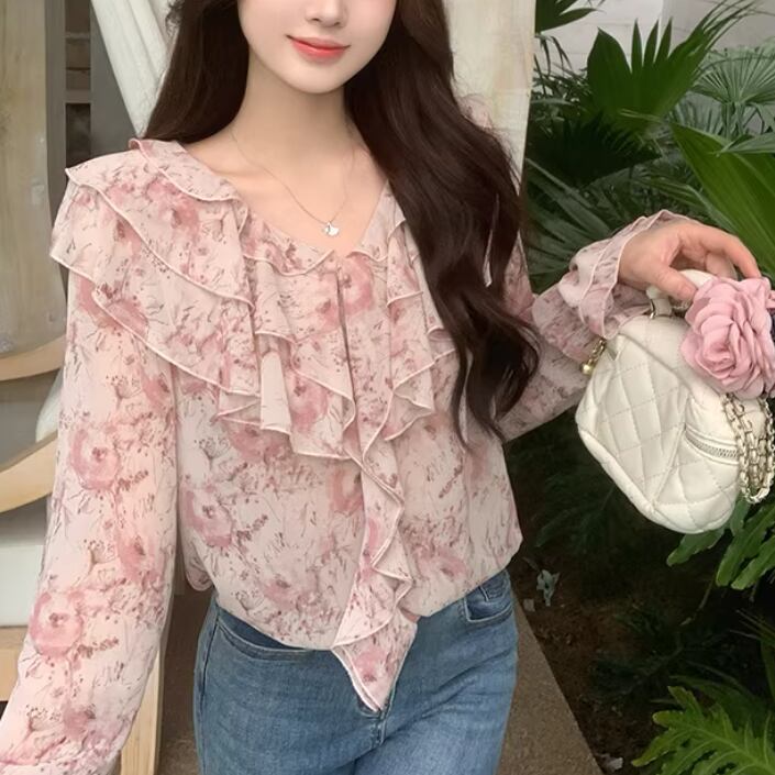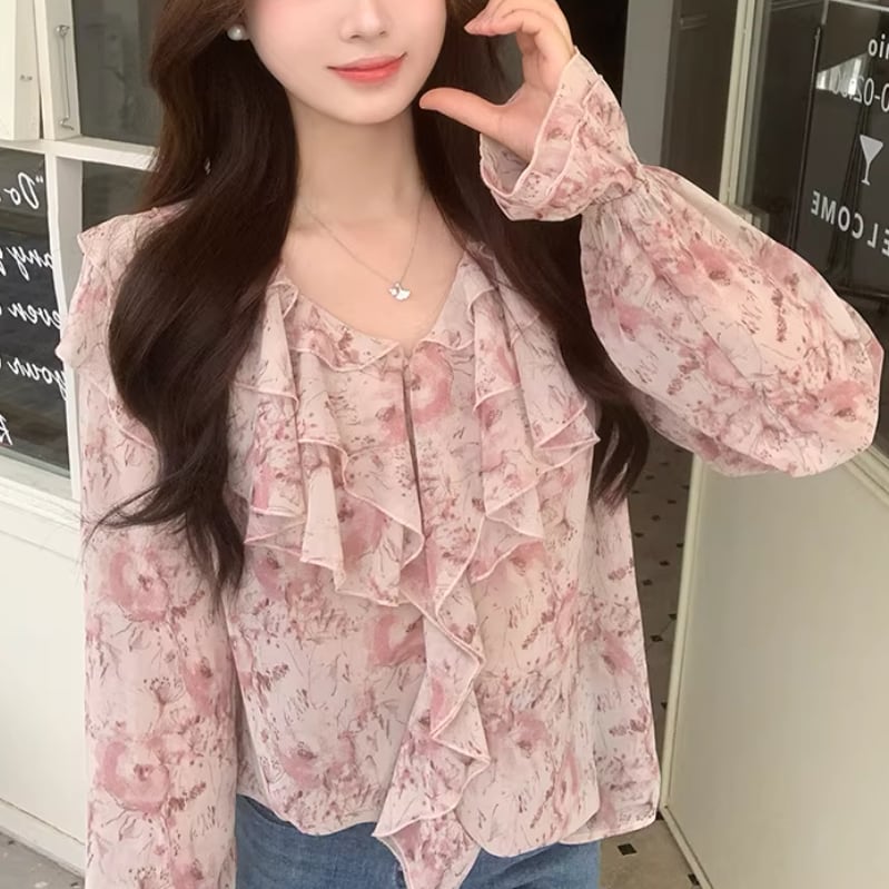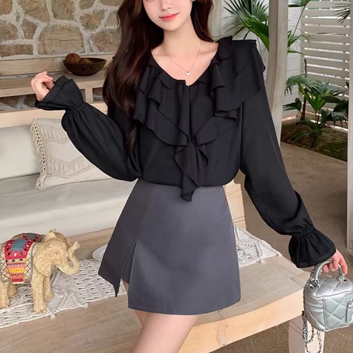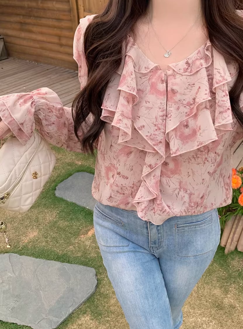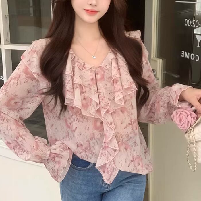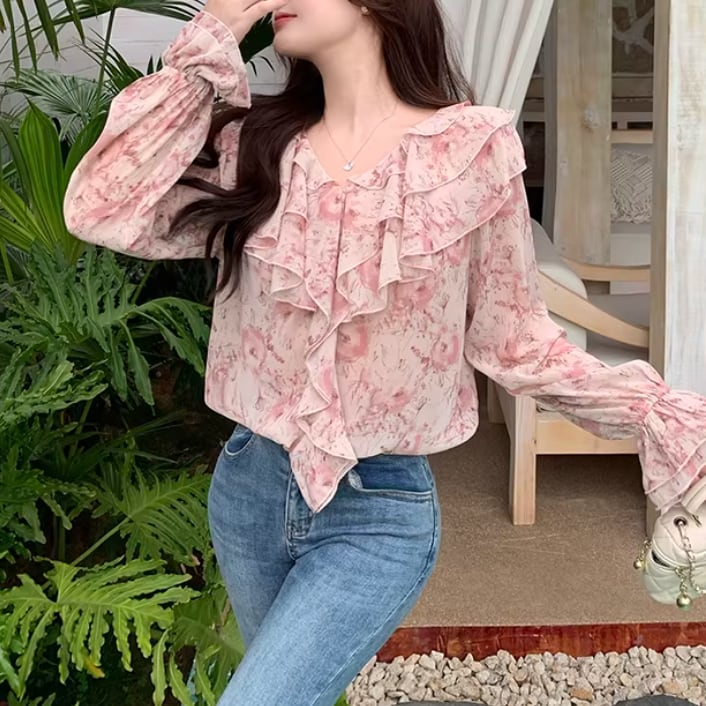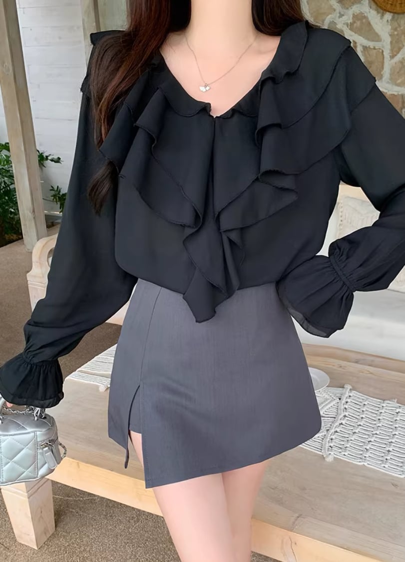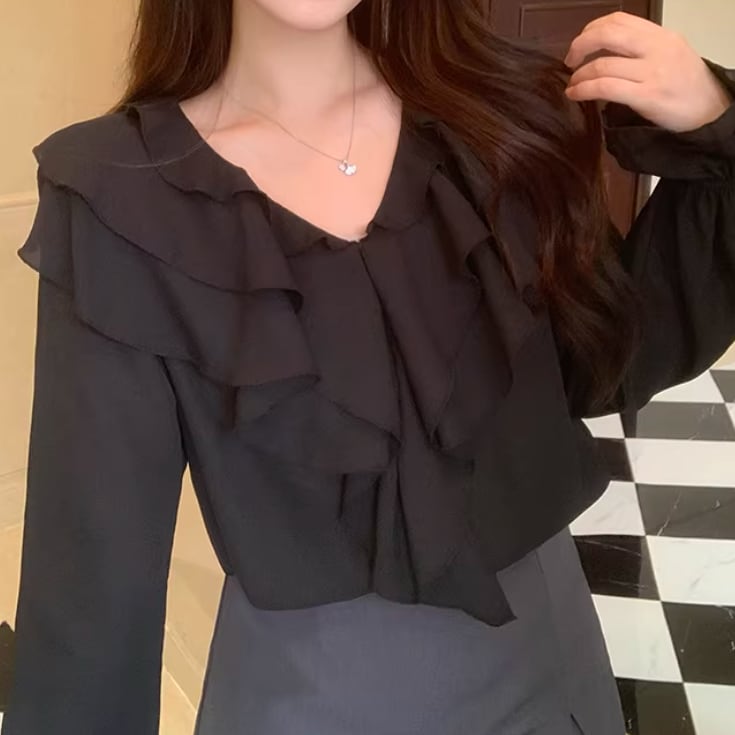 Vネックレースラッフルブラウス ・75382