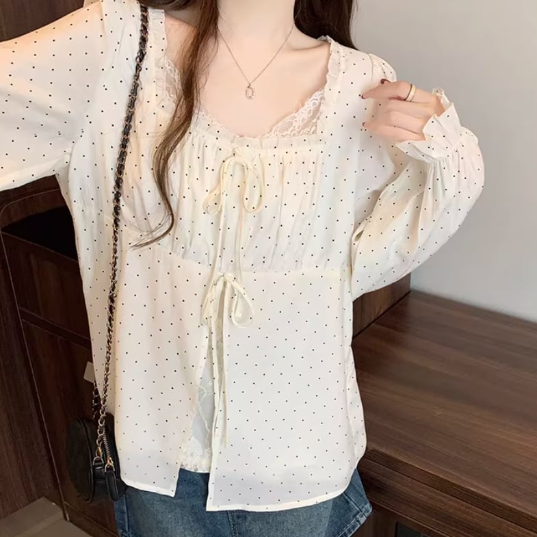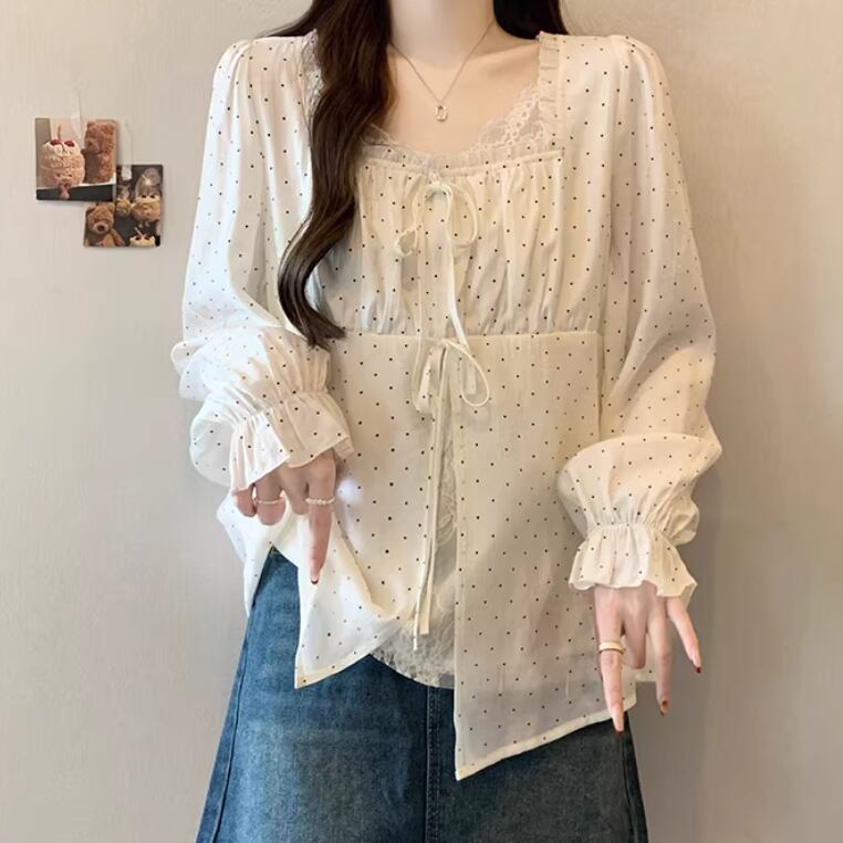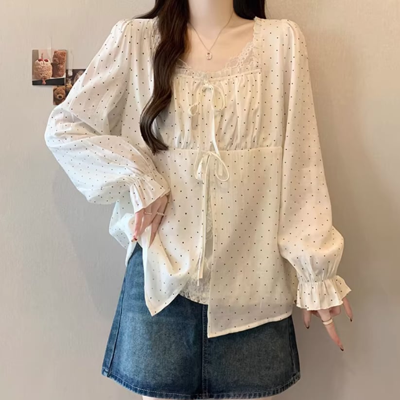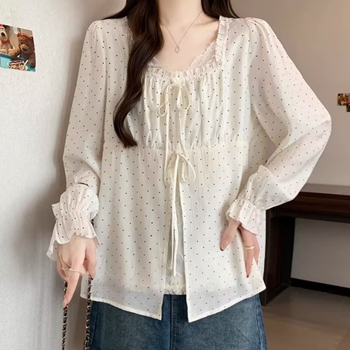 Vネックレースラッフルブラウス ・75382