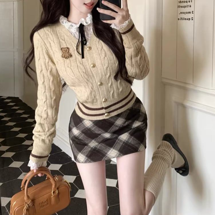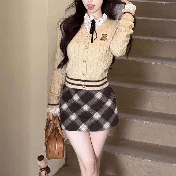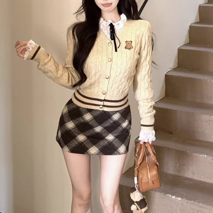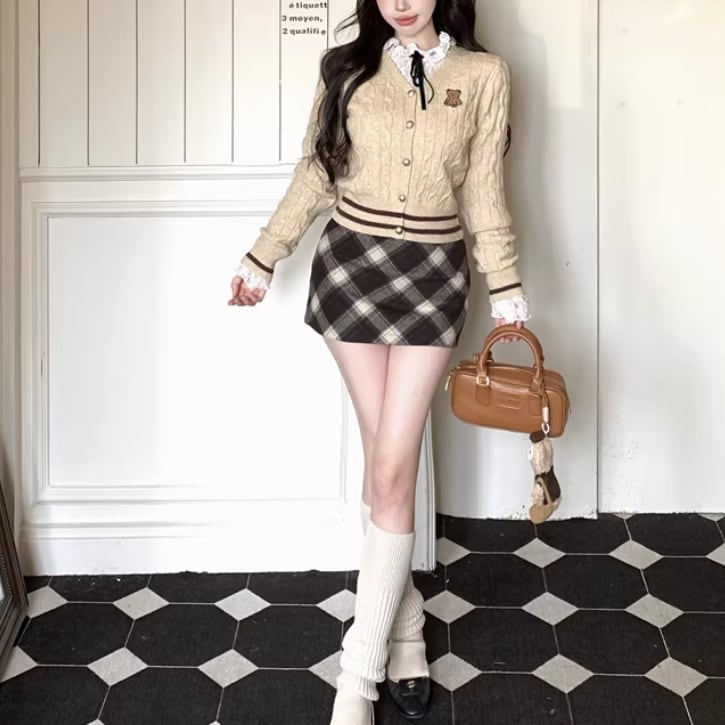 【2点セット】ポイントチェッククルーネックニットカーデ+チェックプリーツスカート ・74241